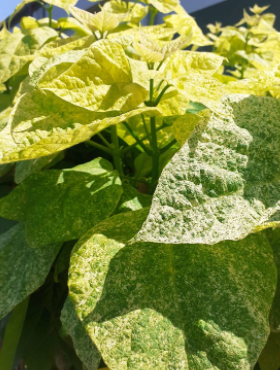 Katalpa szczepiona na pniu Pulweranta odmiana o złoto-zielonych liściach, nakrapianych na biało