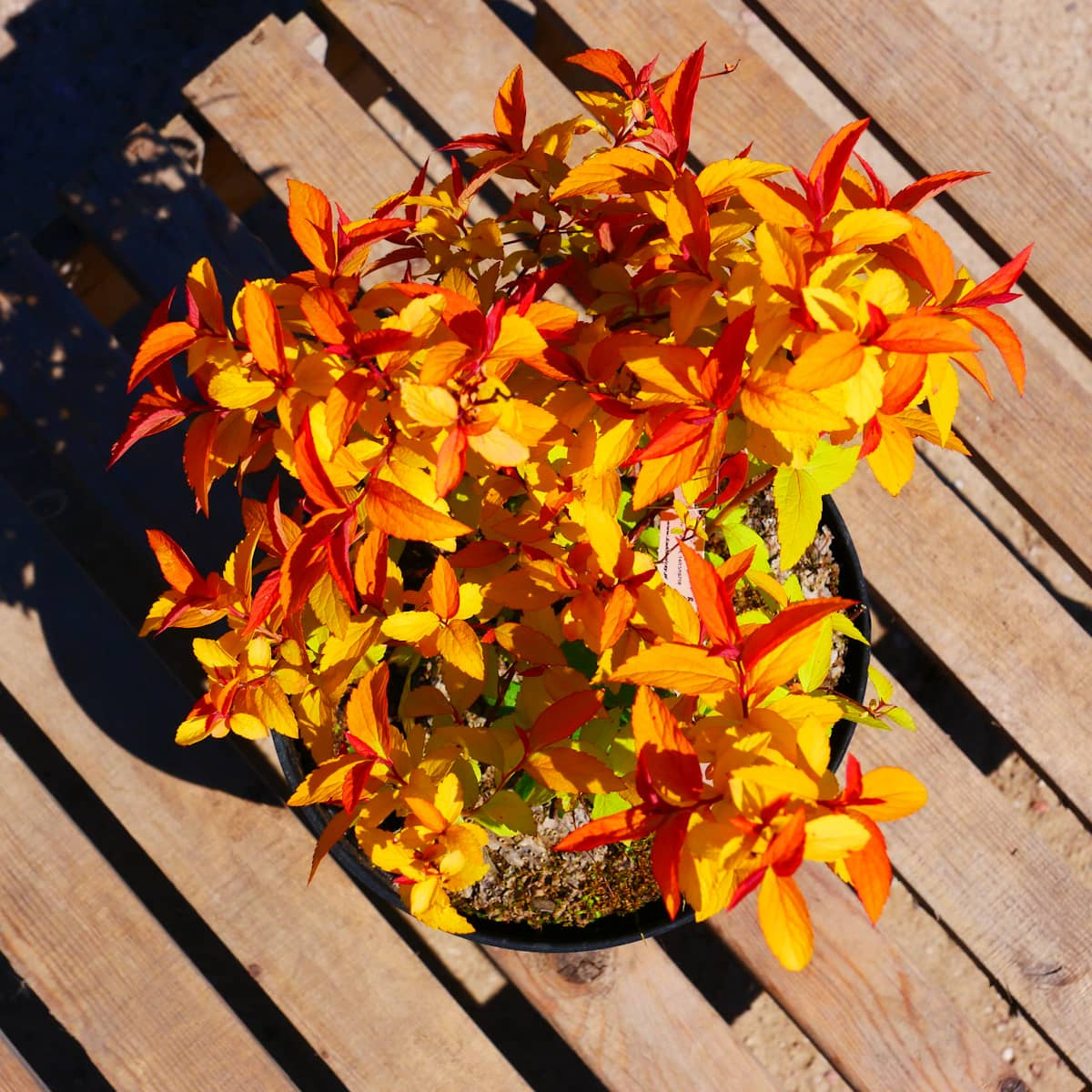 Tawuła Goldflame to krzew o wyjątkowo wysokiej wartości dekoracyjnej, który łączy efektowny wygląd z łatwością uprawy. Jej największym atutem jest zmienność barw liści – od intensywnie pomarańczowożółtych na początku sezonu, przez złocistożółte latem, aż po ognistorude jesienią. Dzięki tej zmienności roślina zachowuje atrakcyjność przez cały sezon wegetacyjny, co sprawia, że jest doskonałym wyborem do miejsc eksponowanych. Utrzymuje regularny, kulisty pokrój, który nie wymaga intensywnego formowania – wystarczy jedno wiosenne cięcie, by zachować gęstą i zwartą sylwetkę krzewu.