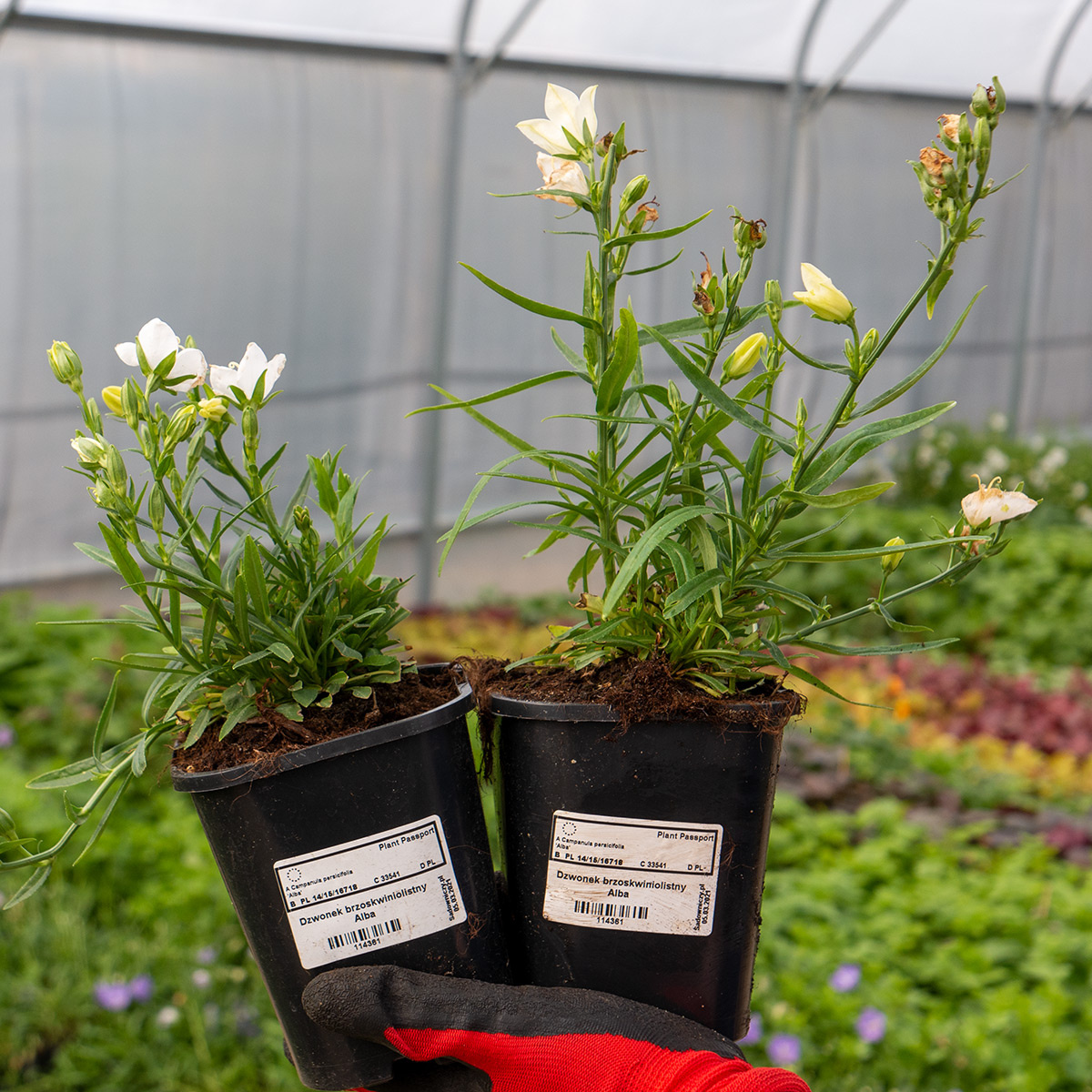 Dzwonek brzoskwiniolistny Takion White to bylina o niezwykle obfitym kwitnieniu, osiągająca około 40 cm wysokości i 25-30 cm szerokości. Roślina tworzy zwarte kępki wąskich, sztywnych, lancetowatych, zielonych liści, które nadają jej elegancki wygląd przez cały sezon. W czerwcu ponad ulistnieniem wyrastają smukłe, nierozgałęzione łodyżki ozdobione dużymi, miseczkowatymi kwiatami w śnieżnobiałym kolorze. Te piękne dzwoneczki, skierowane ku górze, zebrane są w grona liczące kilkanaście kwiatów, co czyni je wyjątkową ozdobą każdej rabaty. Dzwonek kwitnie od maja do lipca, a jego wszechstronność pozwala na wykorzystanie w różnych stylach ogrodowych. Więcej pomysłów na rośliny do swojego ogrodu znajdziesz, przeglądając inne sadzonki bylin.