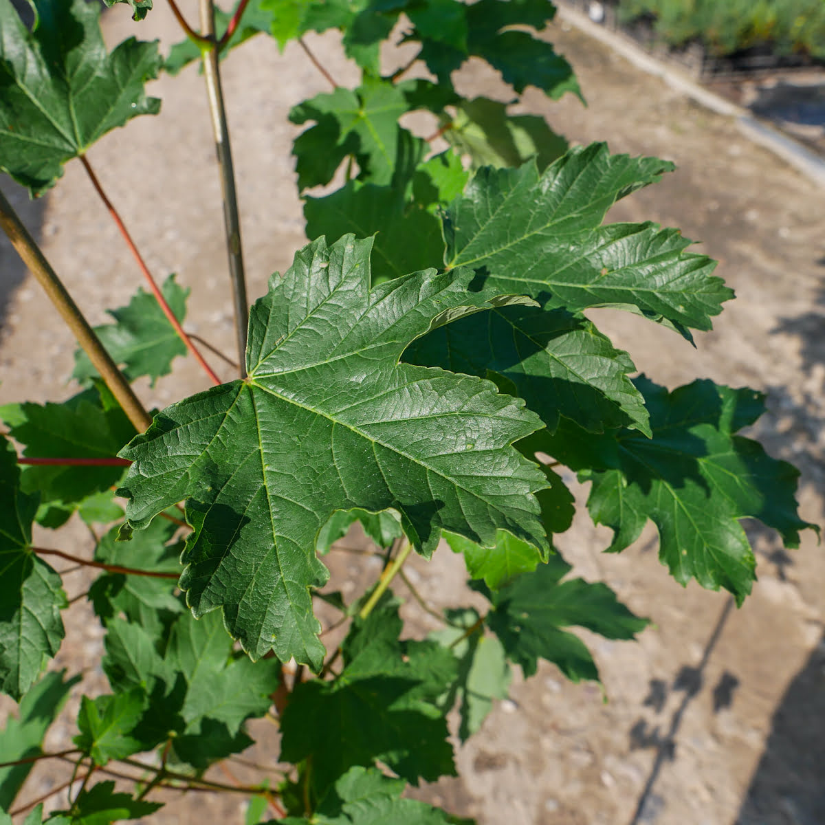 Drzewo dorastające do około 30 metrów wysokości, o regularnej, szerokojajowatej koronie osadzonej na prostym, silnym pniu. Kora szarawa, początkowo gładka, z wiekiem żłobiona i łuszcząca się. Liście pięcioklapowe o szerokich klapach, z wierzchu barwy ciemnozielonej i matowe, od spodu szarozielone lub szare. Jesienią liście przebarwiają się na żółto.