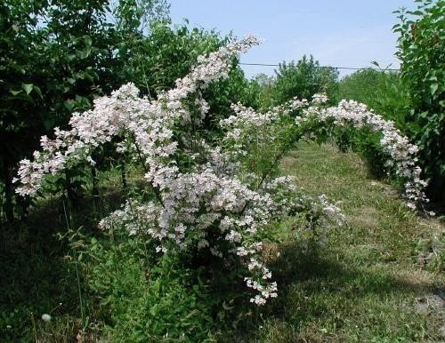 prawdziwy biały kruk w ogrodzie, ponieważ gdy zakwita, obsypany licznymi różowo białymi kwiatami, które rozwijając się, bardzo