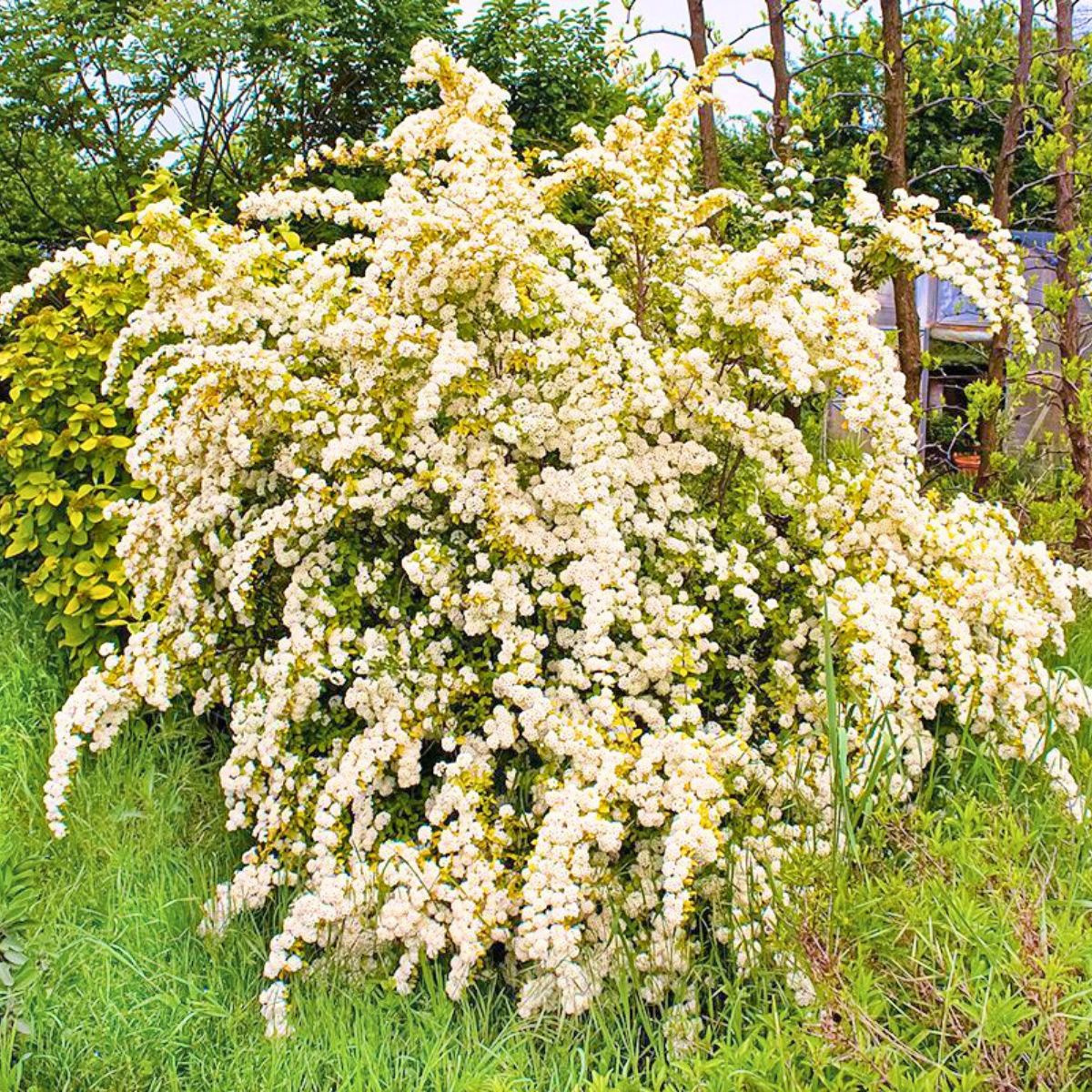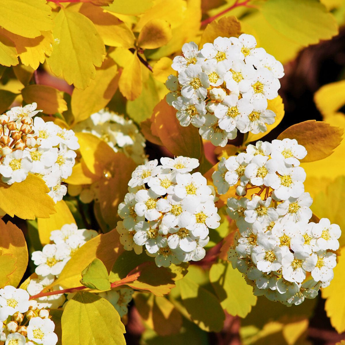 Kwitnienie tawuły van Houtte'a Gold Fountain