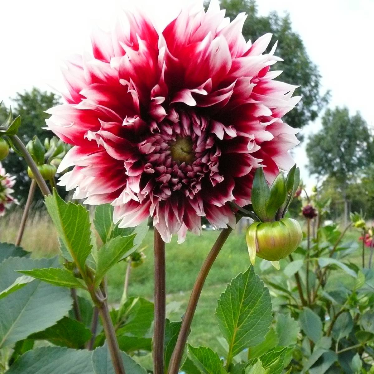 Rodzina: Asteraceae - Astrowate. Dalie, zwane również georginiami, pochodzą z Meksyku i Gwatemali. W Europie pojawiły się w drugiej połowie XVIII w., a ich nazwa pochodzi od nazwiska szwedzkiego botanika Andreasa Dala. Prace hodowlane sprawiły, że z tych kwiatów stworzono tysiące odmian i trudno obecnie spotkać taki rodzaj roślin, który mógłby się poszczycić takim bogactwem form. Kłącza bulwiasto zgrubiałe, łodygi grube, rozgałęzione, wewnątrz puste, liście pierzaste. Karpy odmian silnie rosnących sadzi się co 50cm, a odmian niskich co 20-30cm. Głębokość sadzenia zależy od wielkości karpy; pąki widoczne w górnej części bulwiastych korzeni muszą znajdować się tuż pod powierzchnią ziemi. Dalie powinny być systematycznie podlewane i kilkakrotnie zasilane nawozami mineralnymi, zwykle do końca lipca. Na 1m2 daje się łącznie około 80g mieszanki nawozowej. Na początku uprawy trzeba odchwaszczać glebę, a później dalie silnie się rozrastają i nie ma takiej konieczności. Odmiany silnie rosnące wymagają palikowania, gdyż pędy łatwo się wyłamują pod ciężarem kwiatostanów. Już od czerwca prowadzi się selekcję i usuwa rośliny słabo rosnące, o odbarwionych i zniekształconych liściach. Przyczyną takich objawów są choroby wirusowe, łatwo przenoszone przez mszyce.
