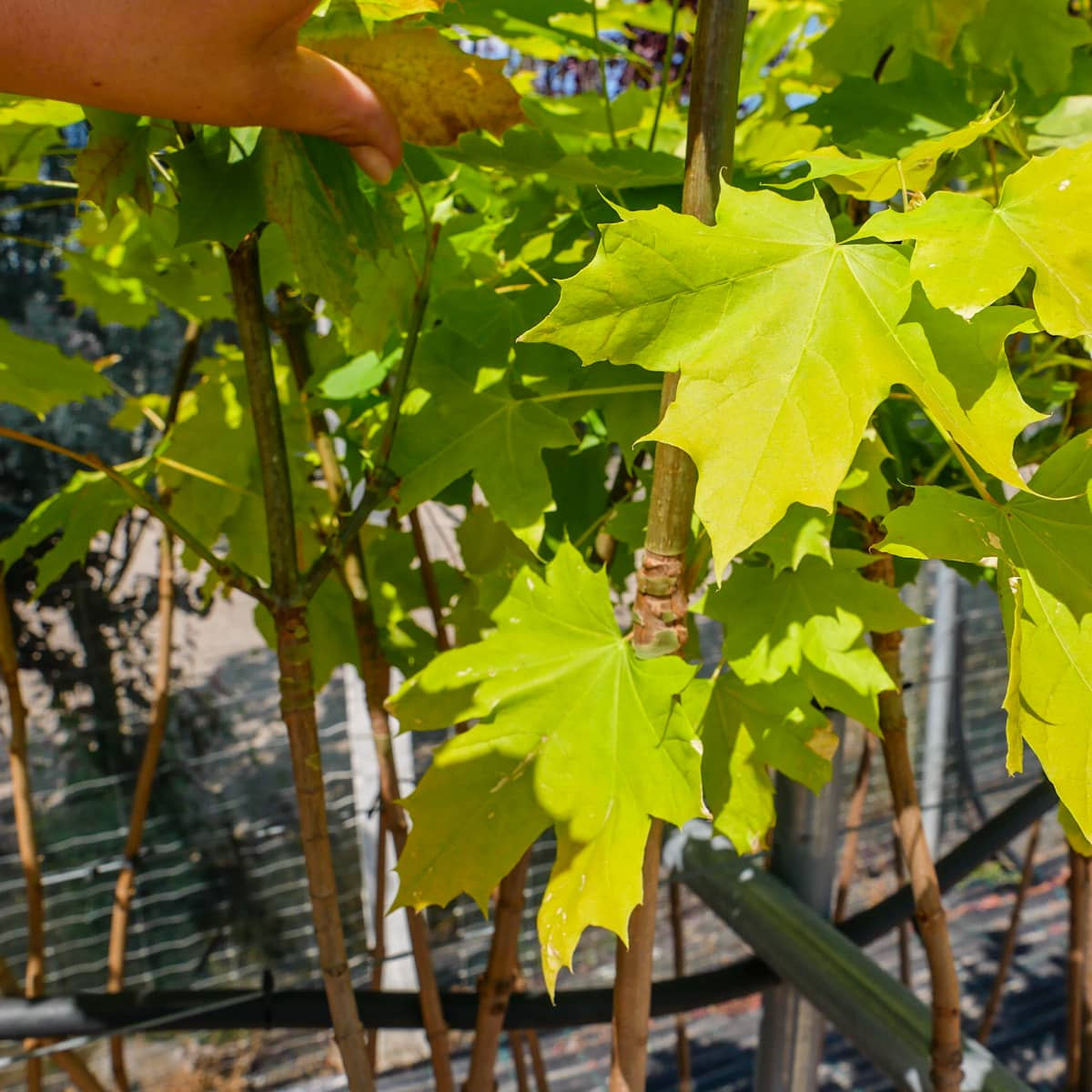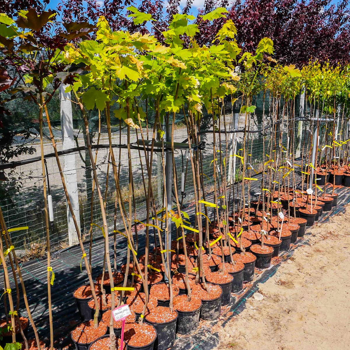 Priceton Gold to odmiana o regularnej, szerokiej koronie i złotożółtych liściach. Forma raczej wzniesiona nie zbyt szybko rosnąca. Kształt liści typowy - duże, do 15 cm długości, dłoniaste, 5-7 klapowe, o długim ogonku. Młode liście mają jaskrawą żółtą barwę, starsze stają się zielonożółte. Z większej odległości, nawet latem, ma jasne "wiosenne" zabarwienie, ładnie komponujące się w krajobrazie z roślinami o ciemniejszych liściach.