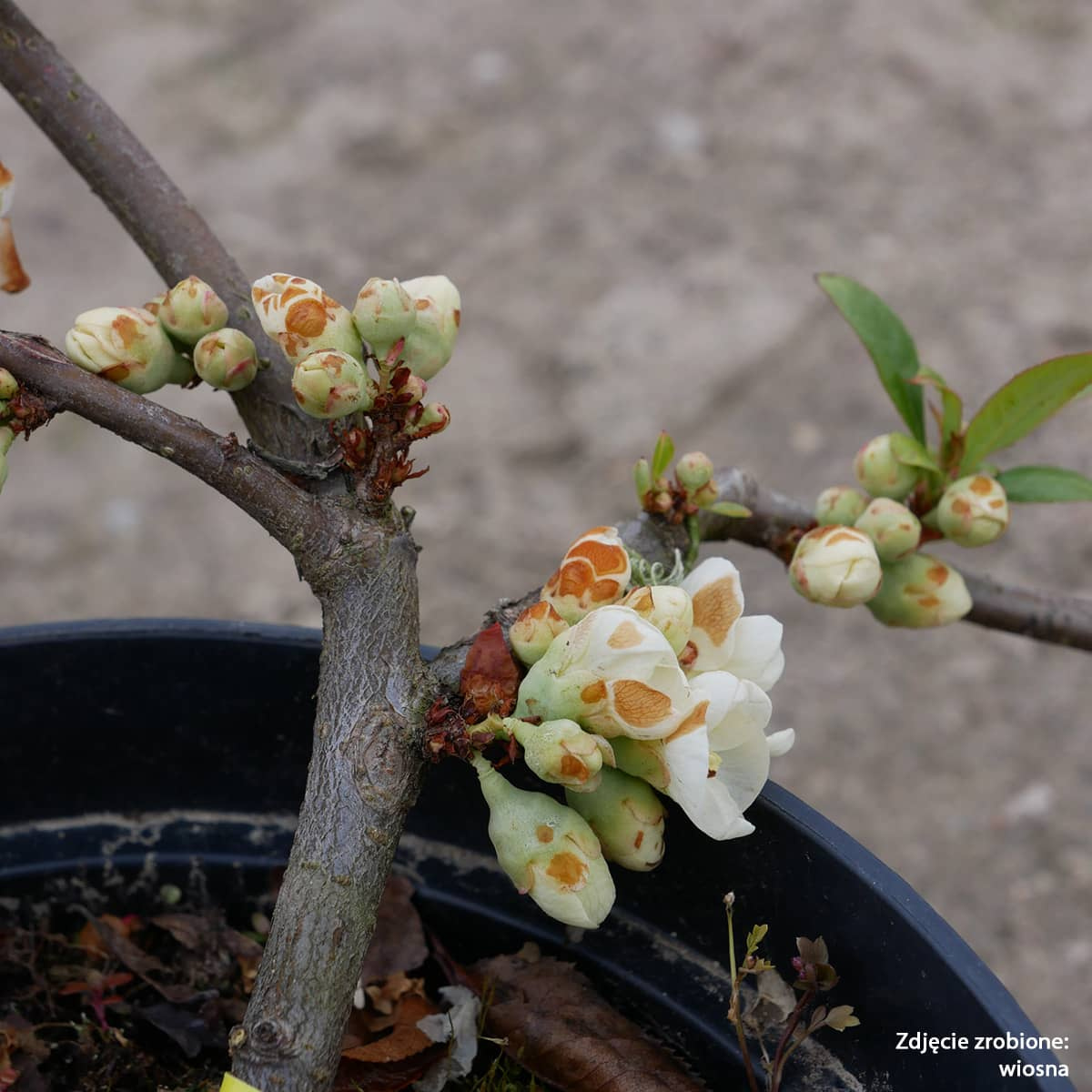 Wdzięczne, urokliwe kwiaty pigwowca okazałego Nivalis to prawdziwa ozdoba ogrodu. Jego czysto białe kwiaty pojawiają się wiosną, od kwietnia do maja, zanim rozwiną się liście, a czasami ponownie we wrześniu. Po kwitnieniu krzew rodzi duże, jabłkokształtne owoce, o zielonożółtej skórce, które świetnie nadają się do przetworów, takich jak nalewki i dżemy.