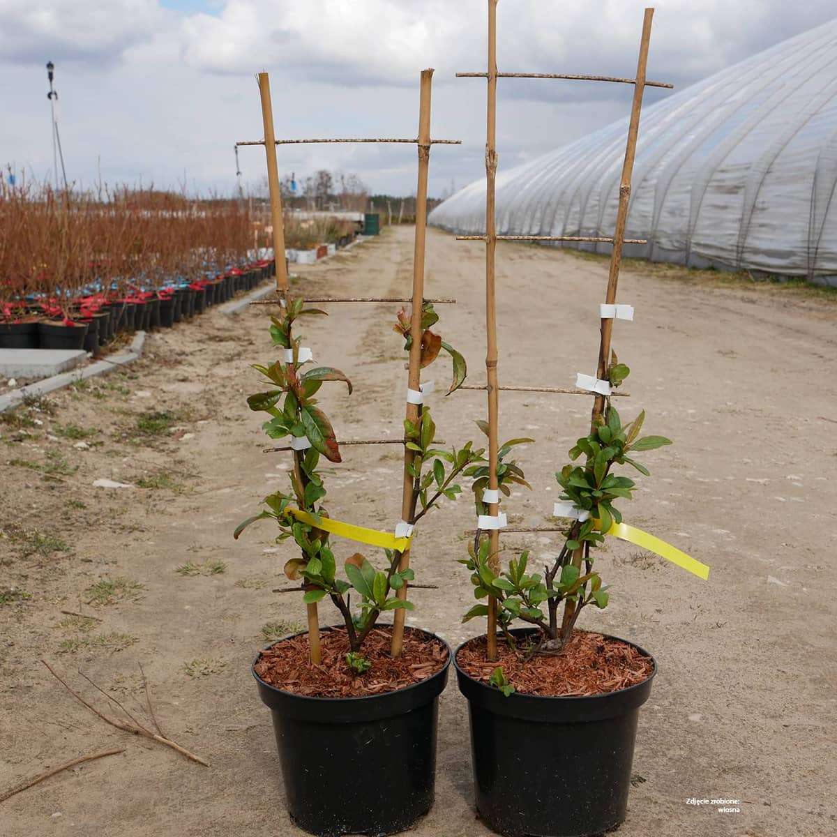 Pigwowiec okazały Nivalis (Chaenomeles speciosa 'Nivalis') to piękna i funkcjonalna odmiana krzewu owocowego, osiągająca do 2 metrów wysokości i szerokości. Początkowo rośnie wyprostowany, a z czasem rozrasta się szeroko, tworząc gęsto splątane, cierniste pędy, które mogą pełnić funkcję naturalnej bariery. Jego ciemnozielone, błyszczące liście mają jajowaty lub eliptyczny kształt, z delikatnym ząbkowaniem, a młode przyrosty wyróżniają się czerwonobrązowym odcieniem. Pigwowiec Nivalis jest idealny zarówno jako ozdoba ogrodu, jak i roślina do przetworów, w tym nalewek. Sadzonki pigwowca okazałego Nivalis to doskonały wybór dla osób szukających krzewu, który łączy walory estetyczne z praktycznym zastosowaniem.
