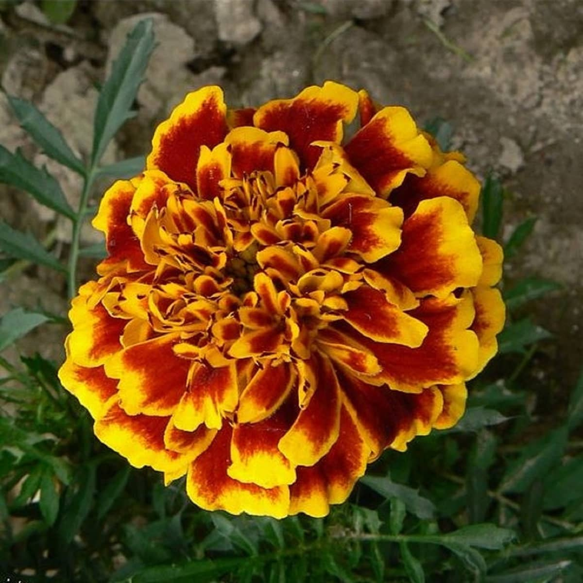 Aksamitka rozpierzchła pełna Bonita Bolero ma kwiat o płatkach dwukolorowych, mahoniowych z pomarańczowym oblamowaniem.