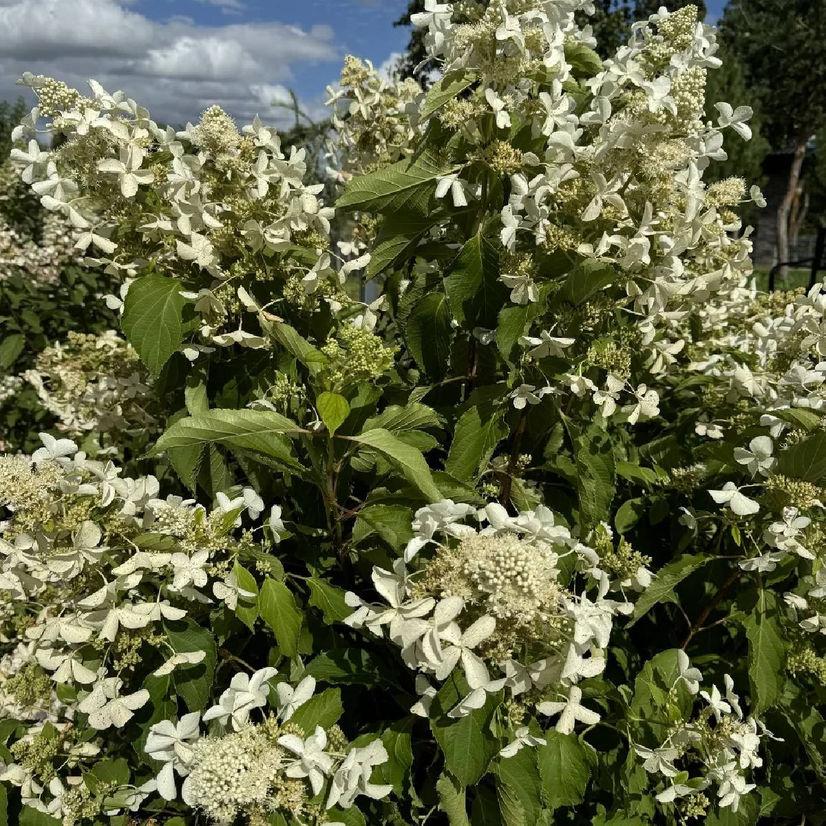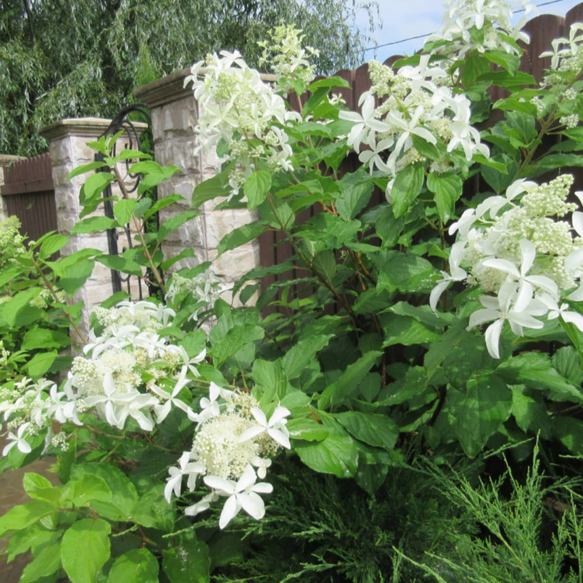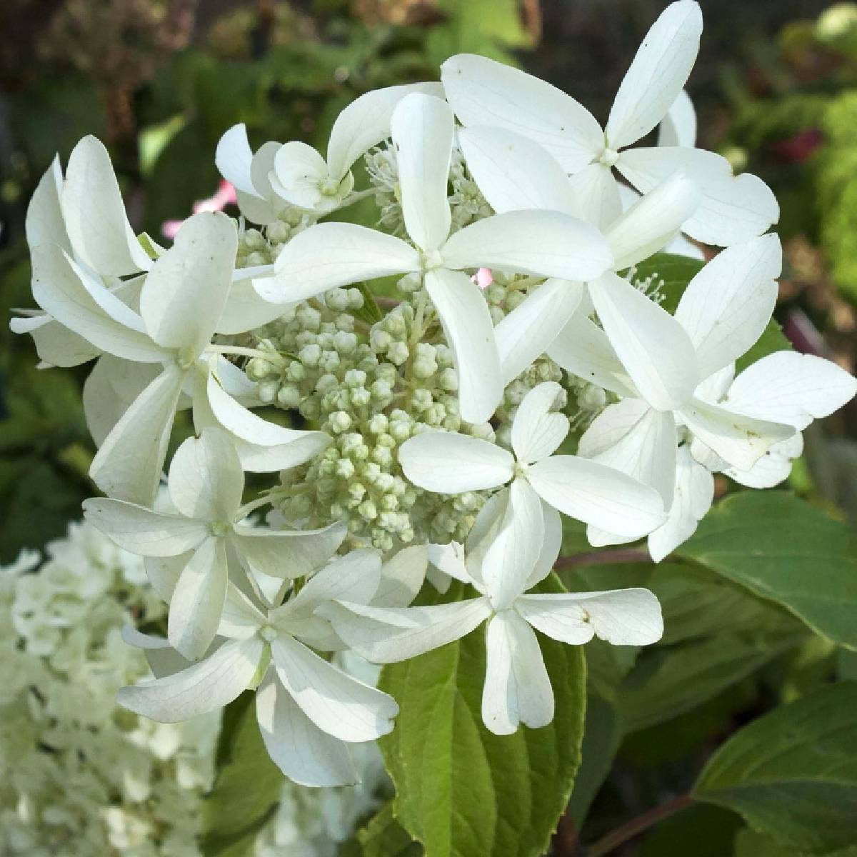 Wdzięczne kwiaty hortensji bukietowej Great Star pojawiają się od lipca do września, zachwycając swoją formą i czysto białym kolorem. Kwiatostany tej odmiany są luźne, przestrzenne i sprawiają wrażenie lekkich oraz zwiewnych. Ich najbardziej charakterystyczną cechą są kwiaty płonne o wąskich, wydłużonych płatkach, przypominających kształtem gwiazdy – stąd też wzięła się nazwa odmiany. W trakcie kwitnienia roślina tworzy efekt delikatnego, falującego obłoku bieli, który pięknie kontrastuje z zielenią liści i ciemniejszym tłem ogrodu. Kwiaty są delikatnie pachnące, co dodatkowo podnosi ich wartość dekoracyjną. W miarę przekwitania mogą lekko kremowieć, zachowując jednak swoją elegancję aż do późnej jesieni.