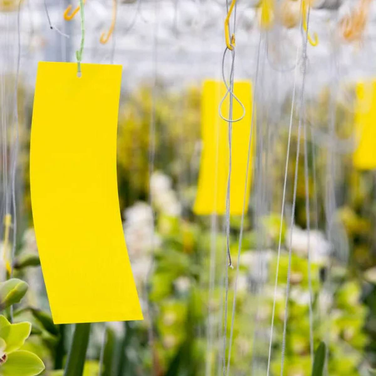 Żółty kolor tablicy lepowej przyciąga szkodniki, które następnie przywierają do lepu.