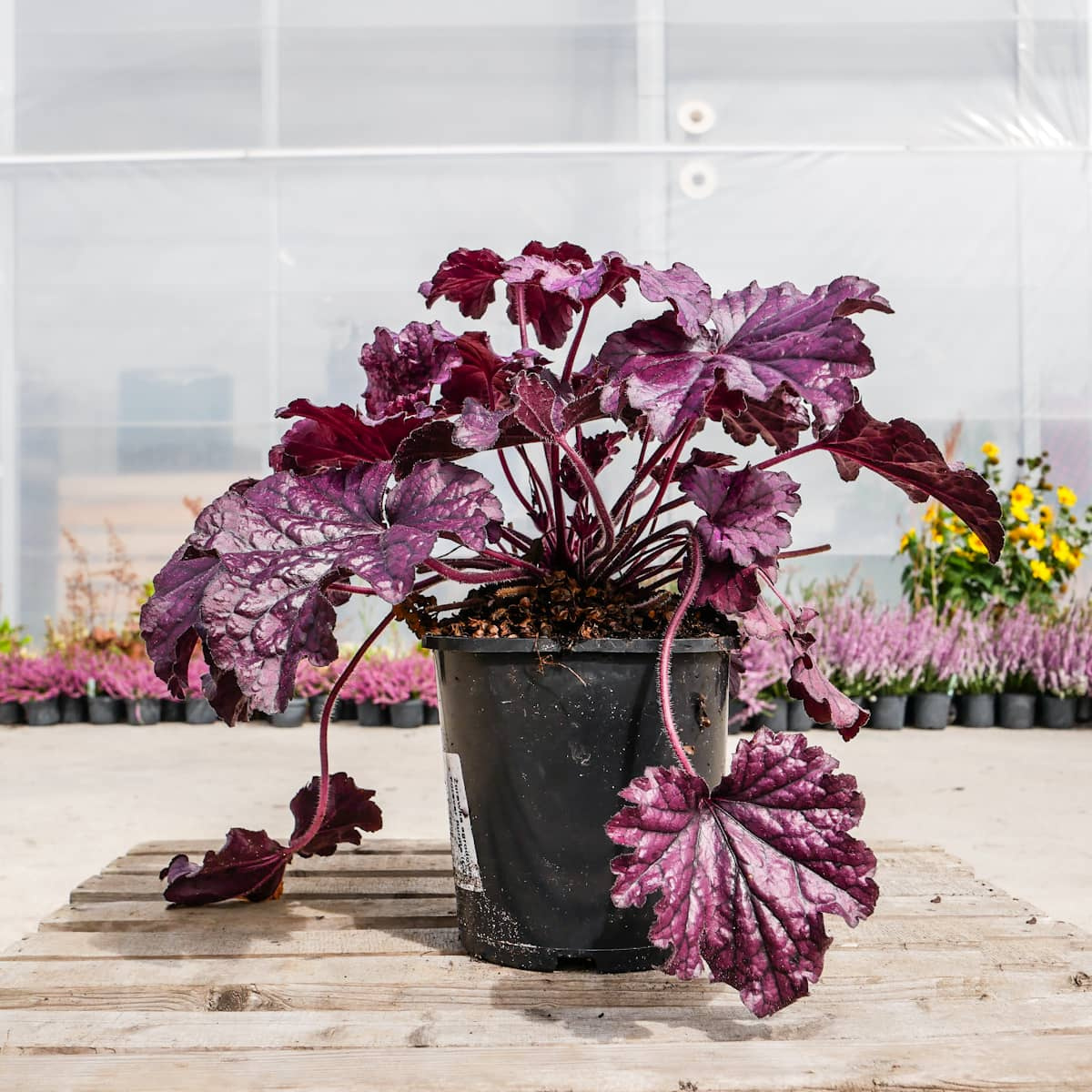 Żurawka Forever Purple to zachwycająca bylina o zwartym pokroju i intensywnie fioletowym wybarwieniu liści, które wyróżniają ją spośród innych odmian. Osiąga wysokość 30-40 cm i szerokość do 55 cm, tworząc gęste, eleganckie kępy. Liście są ciemnofioletowe, błyszczące, z wyraźnym żyłkowaniem i delikatnie pofalowanymi brzegami w formie falbanki. Wiosną i jesienią barwa liści nabiera szczególnej intensywności, co czyni tę odmianę prawdziwą ozdobą ogrodu. Od maja do września na wzniesionych łodygach pojawiają się urocze, jasnoróżowe kwiaty w kształcie drobnych dzwoneczków, które świetnie kontrastują z ciemnymi liśćmi. Aby odkryć inne wyjątkowe byliny, odwiedź Sadzonki bylin.