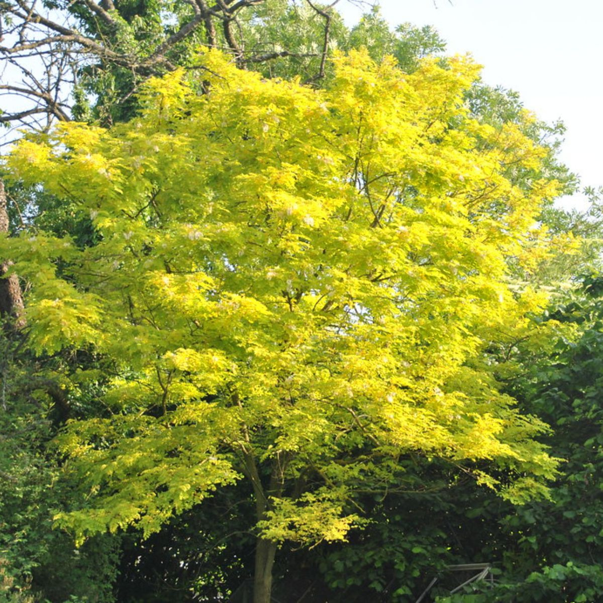 Odmiana Sunburst wyróżnia się głównie ulistnieniem — młode liście są złocisto‑żółte, co sprawia, że drzewo bardzo dobrze kontrastuje z zielenią innych roślin. Z czasem liście zielenieją, a jesienią często przebarwiają się na ciepłe odcienie, co daje efekt sezonowej zmiany kolorów. Korona jest luźna, nieregularna, co nadaje roślinie lekkości i naturalnego charakteru.