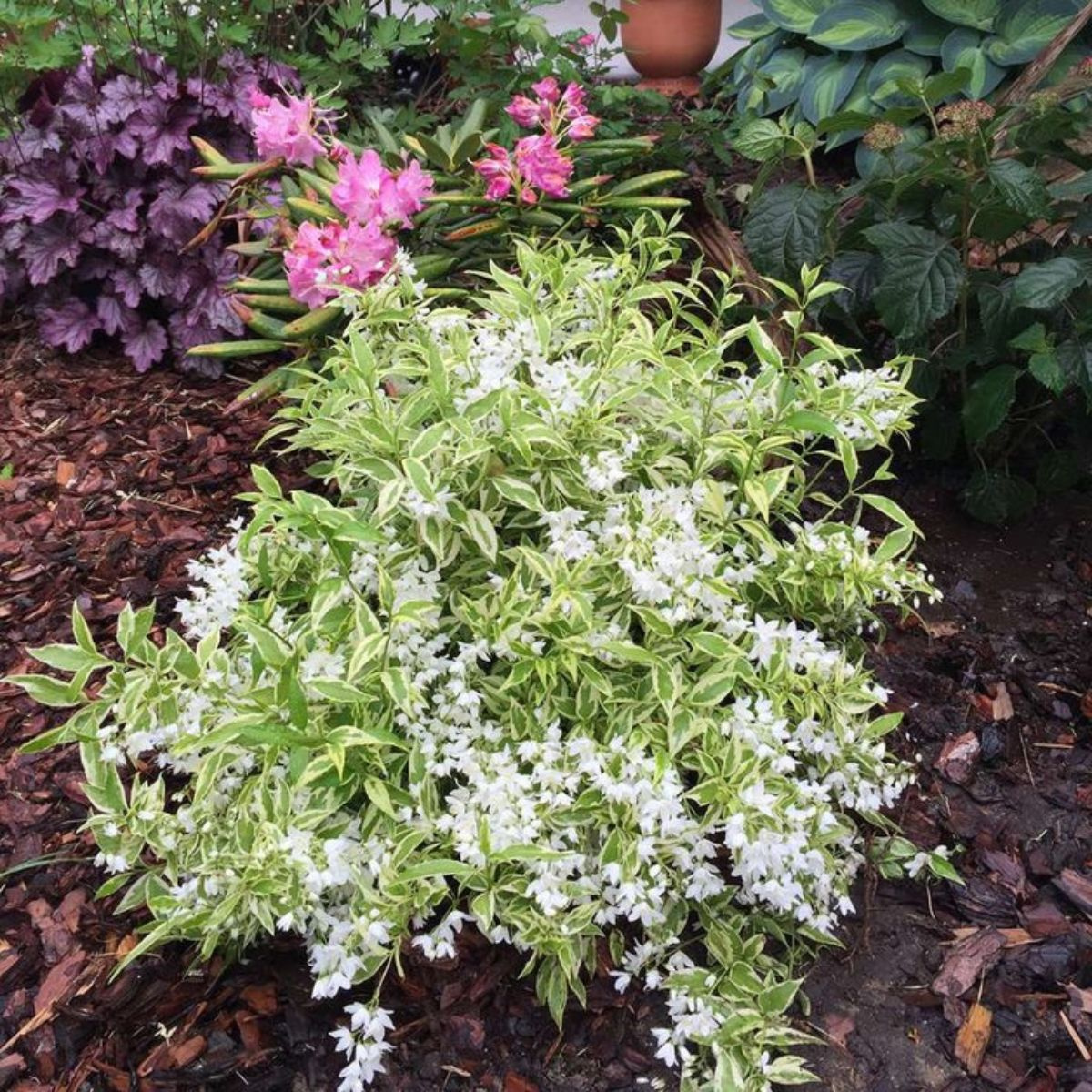 Liczne, drobne białe kwiaty – największa ozdoba krzewu – są zebrane w gęste wiechowate kwiatostany.