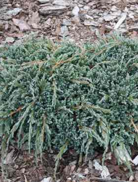 Krzewy płożące się, iglaste o szeroko rozpostartych pędach i stalowoniebieskim odcieniu igieł z charakterystycznie wypiętrzającym się środkiem i wydłużonymi, łukowato przewieszonymi pędami. Po 10 latach uprawy krzew dorasta do 0,3 metra wysokości i 1 metra średnicy. Najmłodsze pędy są brązowopomarańczowe, część z nich jest wyciągnięta, inne pozostają krótkie. Ulistnienie w formie igieł. Igły są krótkie, stalowoniebieskie, w dotyku kłujące.