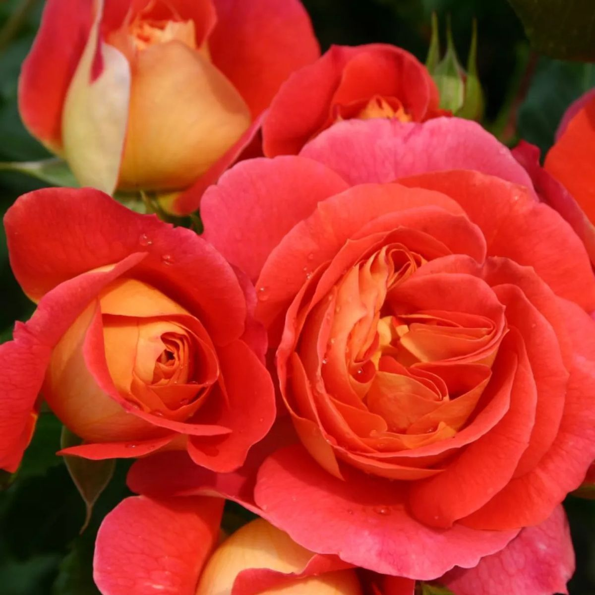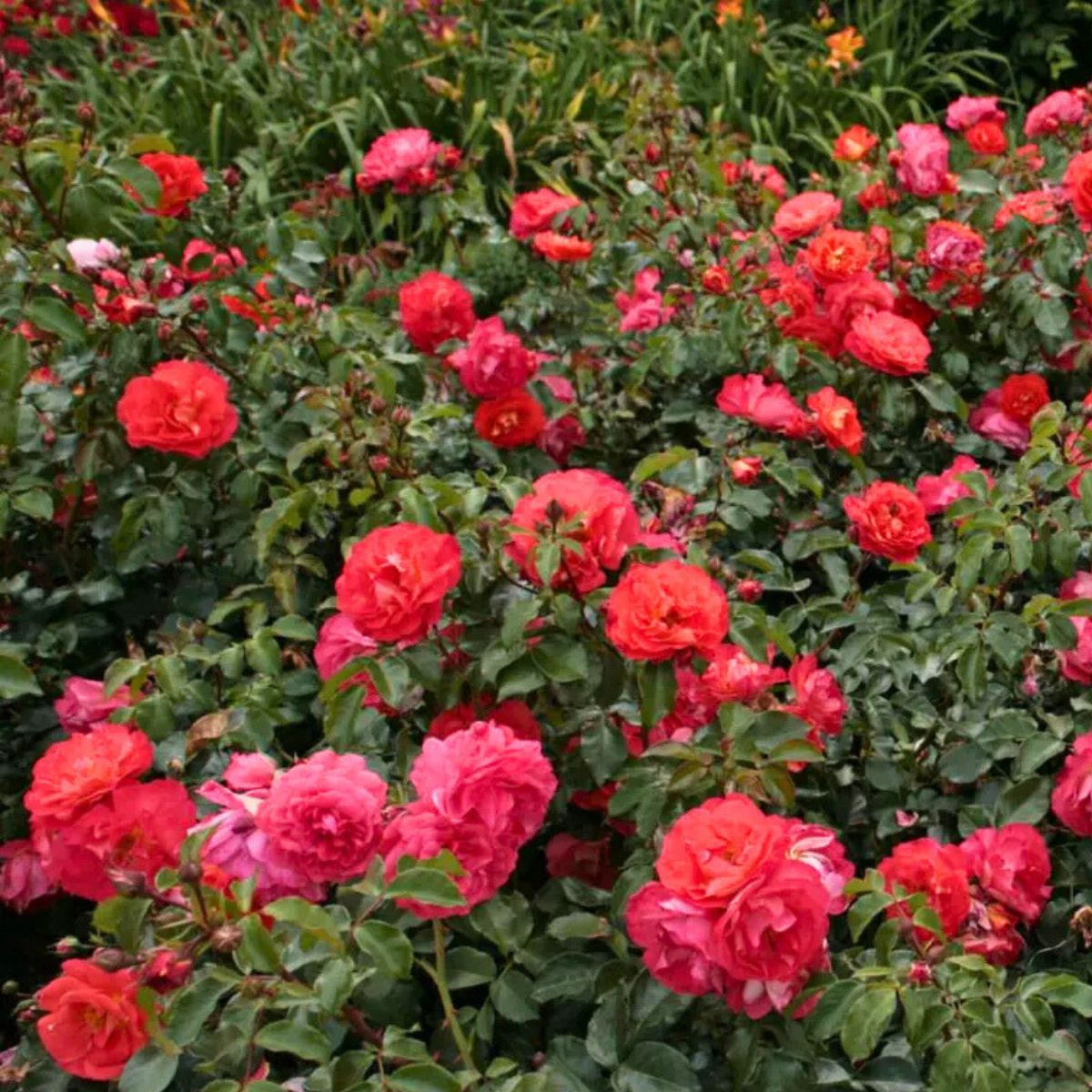 Róża rabatowa Gebruder Grimm pomarańczowo-czerwona