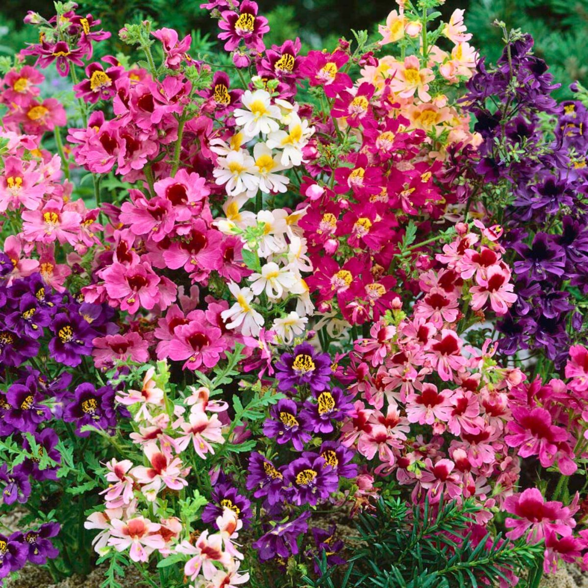 Kwiaty białe, różowe, karminowe i lila, nakrapiane kontrastowymi plamkami.