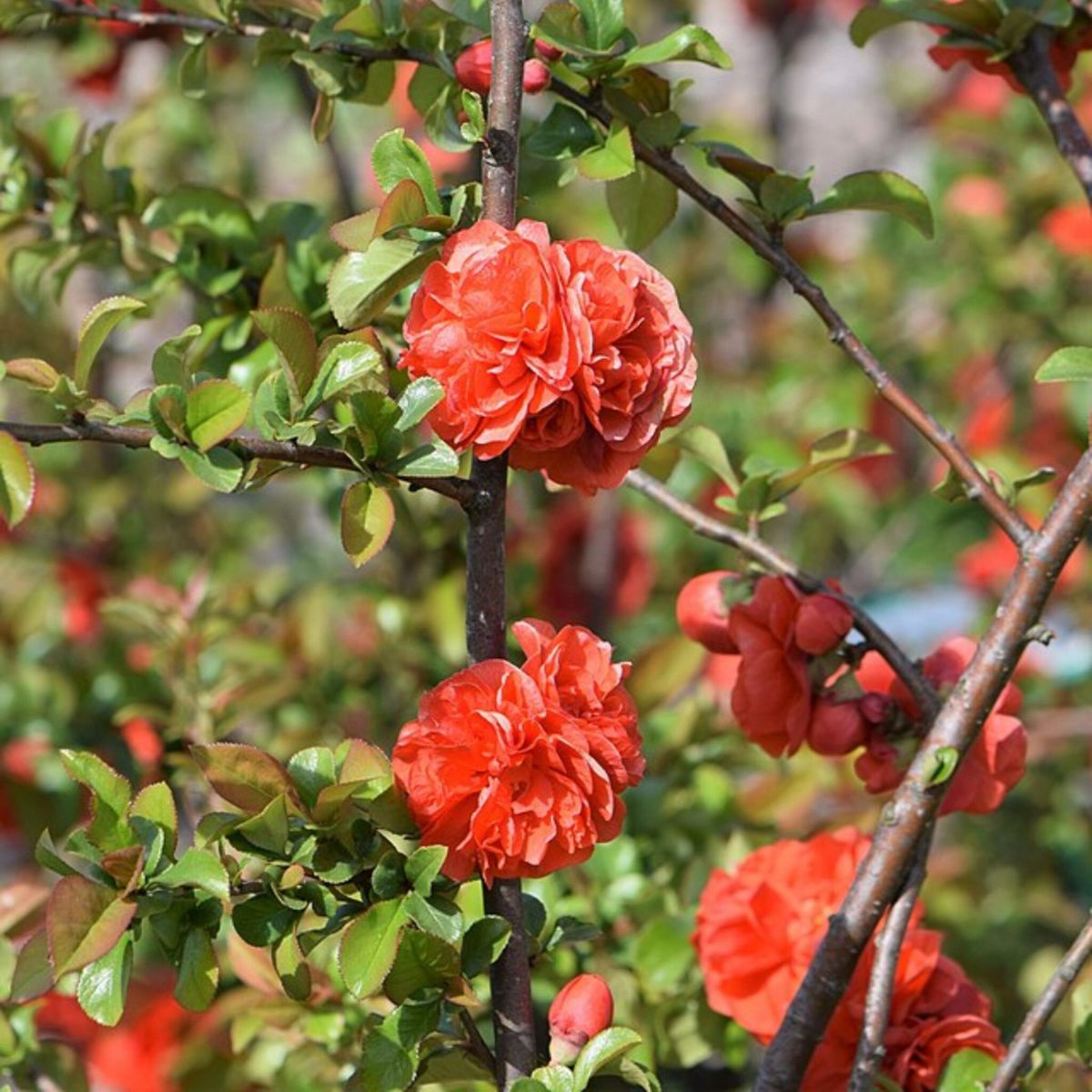 Krzew, początkowo wyprostowany, później szeroko rozpostarty. Pokrój zmienny. Osiąga 1,5 m wys. i szer. Pędy gęsto splątane, pokryte cierniami. Liście ciemnozielone, błyszczące, jajowate lub eliptyczne z ostrym końcem, nieznacznie ząbkowane, ustawione naprzemiennie. Przy ogonku liścia charakterystyczne, zaokrąglone przylistki. Młode przyrosty czerwonawobrązowe. Kwiaty bardzo efektowne, czerwono-pomarańczowe, pojedyncze, skupione po 2-4 razem. Kwitnie obficie przed rozwojem liści, na zeszłorocznych pędach, od kwietnia do maja. Często powtarza kwitnienie, IX. Krzew łatwy do uprawy. Dobrze rośnie na wszystkich glebach ogrodowych, najlepiej w pełnym słońcu. Do sadzenia pojedynczo i w grupach. Polecany do tworzenia trudnych do pokonania barier.