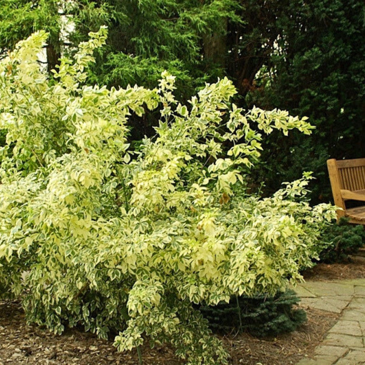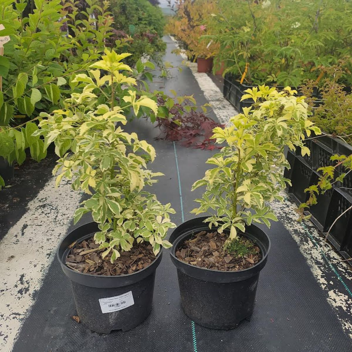 Luźny wyprostowany krzew z licznymi drobnymi gałązkami, gałązkami starszym wieku nieregularny z przewieszającymi się pędami. Wielkość 1-1,5 m, często szerszy niż wyższy. Bardzo stare egzemplarze do 2,5 m wys. i szer. Liście sezonowe, dłoniasto złożone z pięciu lancetowatych listków. Brzeg liści z kremową, nieregularną, obwódką, bardzo atrakcyjny. Stanowisko całkiem słoneczne do cienistego. Liście długo nie opadają, nie przebarwiają się. Kwiaty jasnożółtozielone, rozdzielnopłciowe, miododajne, dwupienne, zebrane w grona, niepozorne, VI-VII. Owoce kuliste, czarne, 6-8 mm średnicy. Bez specjalnych wymagań. Mrozoodporny, odporny na klimat miejski i suszę. Do zastosowania z kontrastowymi roślinami, a także w partiach brzegowych pod drzewami. Ze względu na charakterystyczne biełoobrzeżone ubarwienie i oryginalną teksturę zastosowanie w zestawieniu z roślinami o purpurowych liściach. Dobrze znosi cięcie.