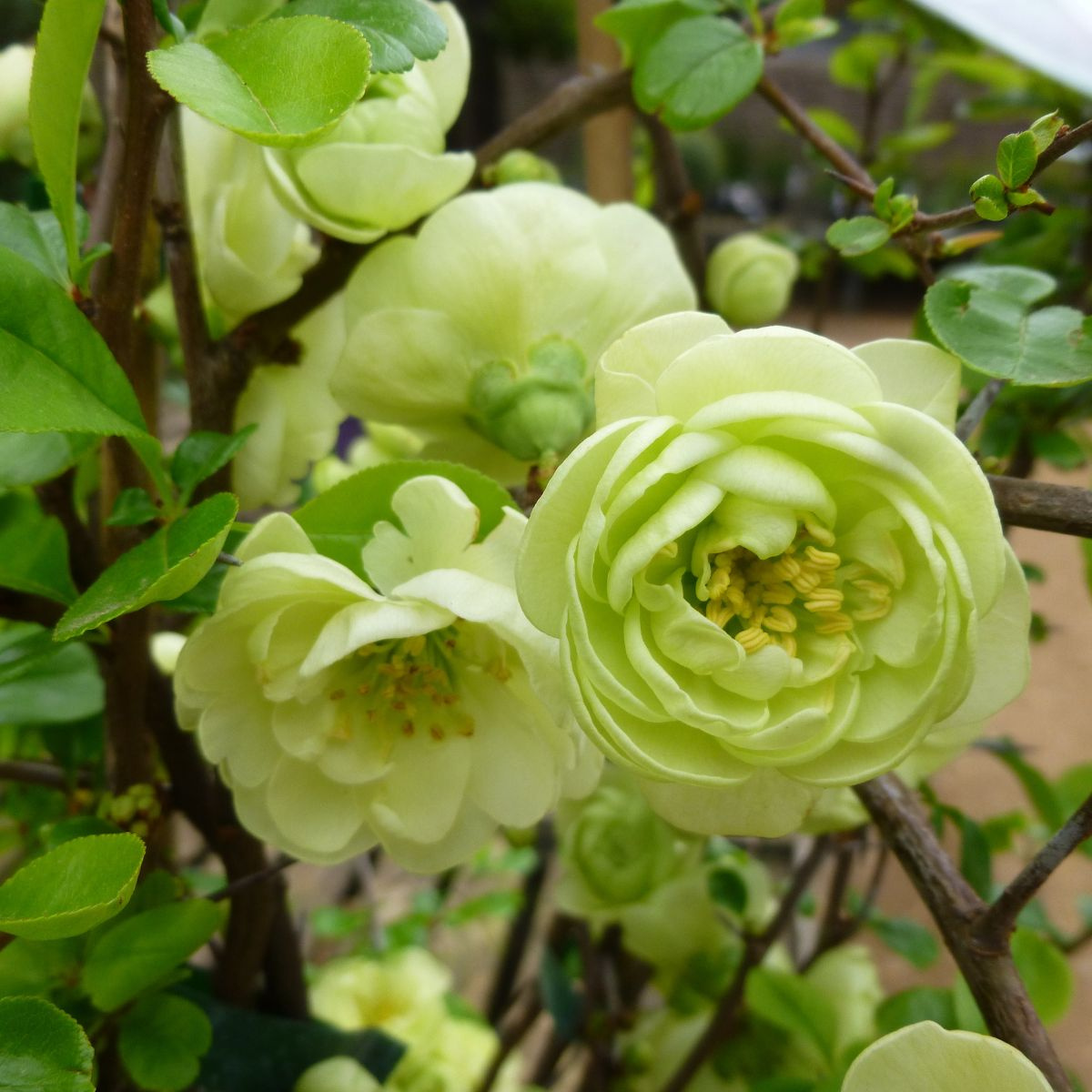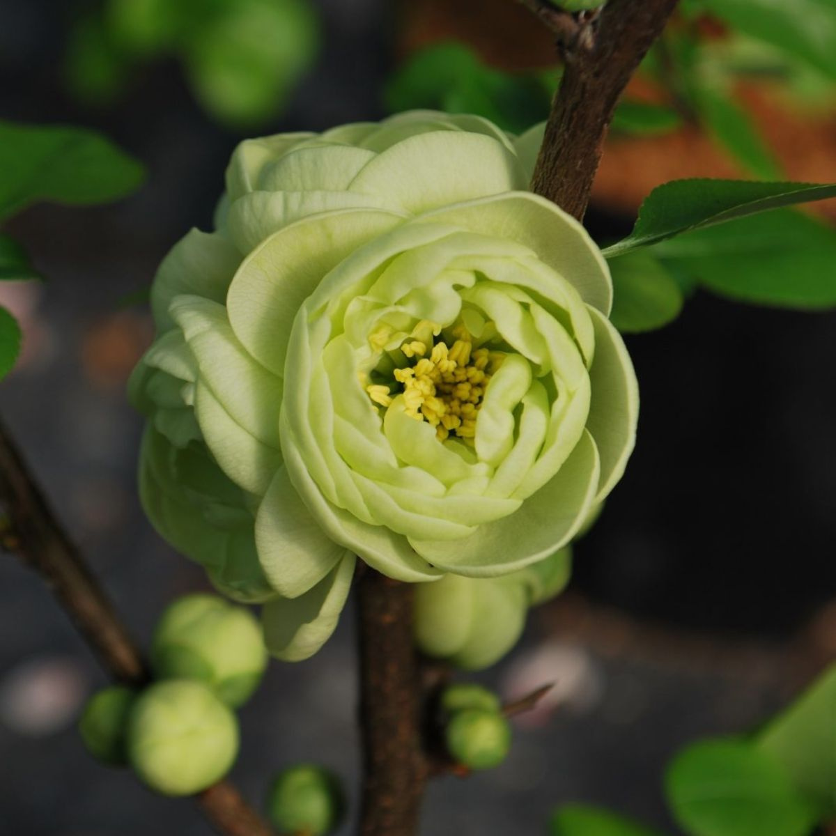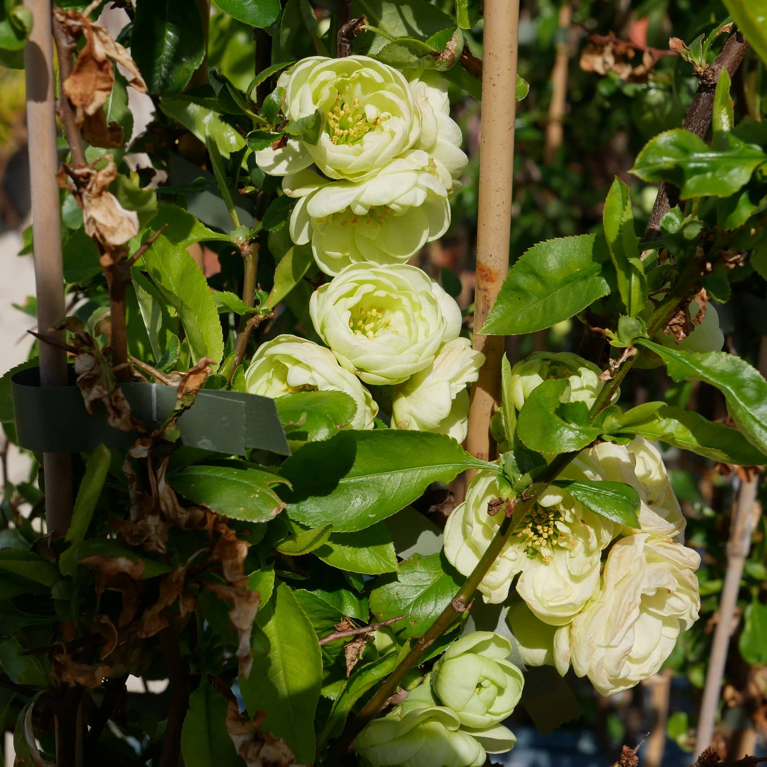 Pigwowiec Kinshiden to wyjątkowa odmiana o efektownych, półpełnych, kremowo-zielonkawych kwiatach, które pojawiają się obficie już od kwietnia. Krzew dorasta do 2 m wysokości w ciągu około 10 lat, rosnąc powoli i zachowując zwartą formę. Kwiaty mają przyjemny zapach i pięknie prezentują się na tle młodych liści, dodając uroku każdemu ogrodowi.