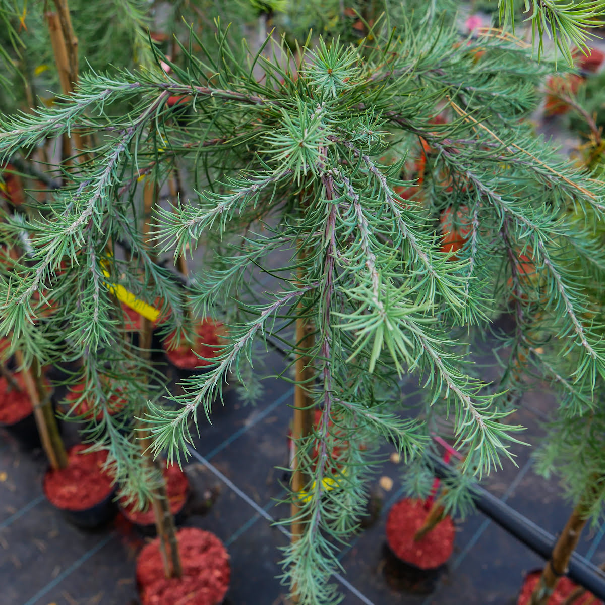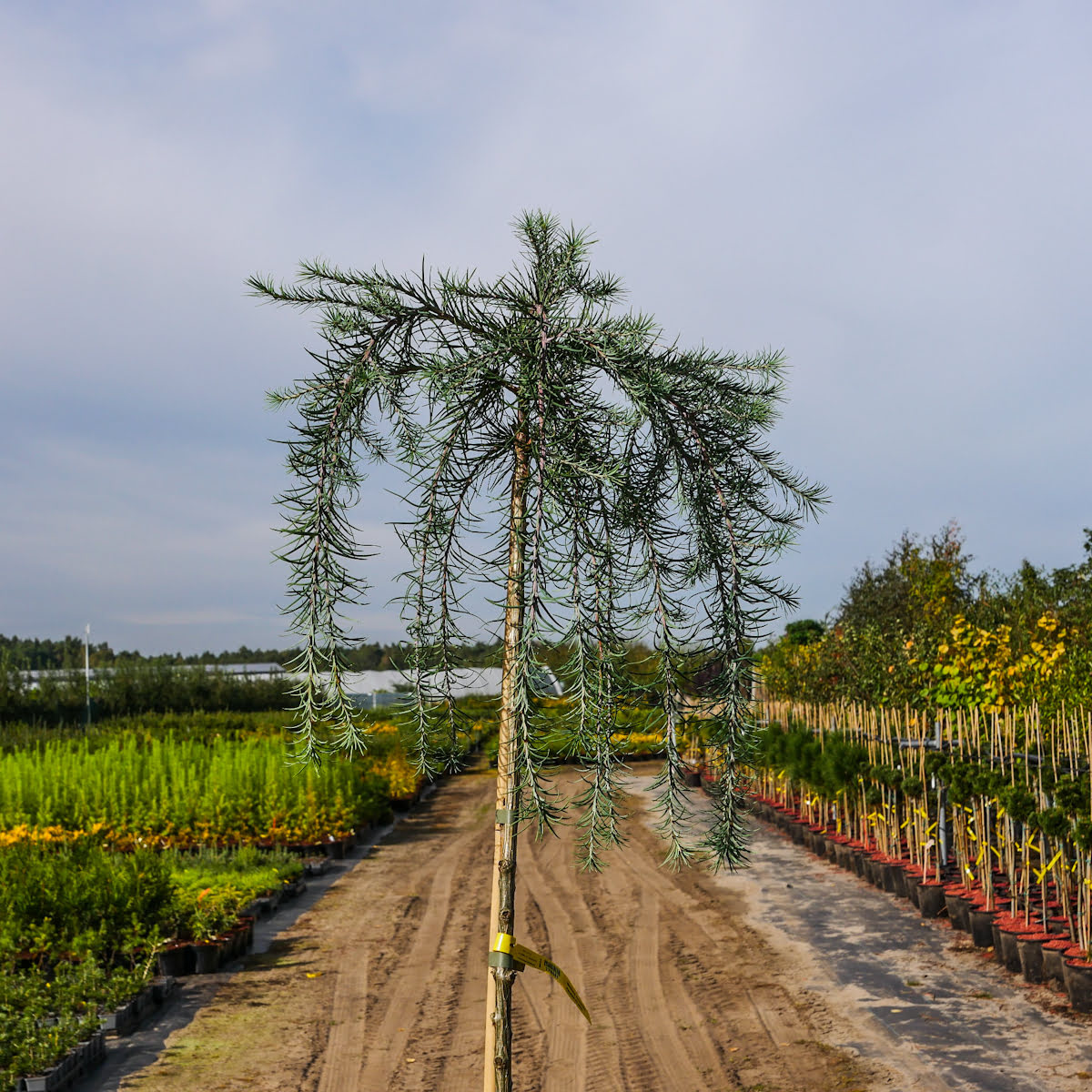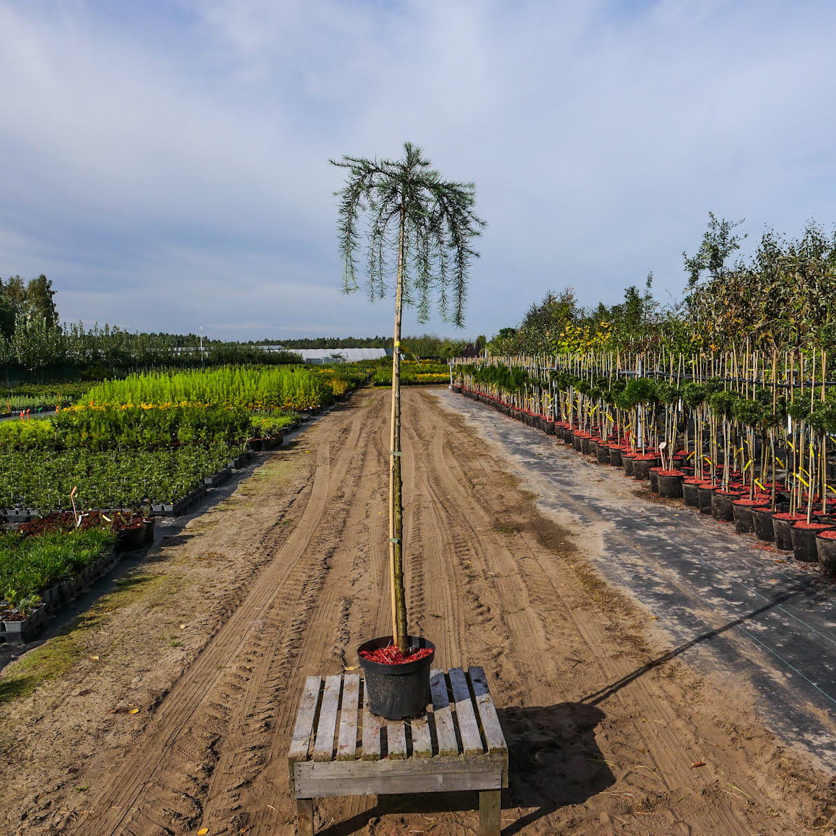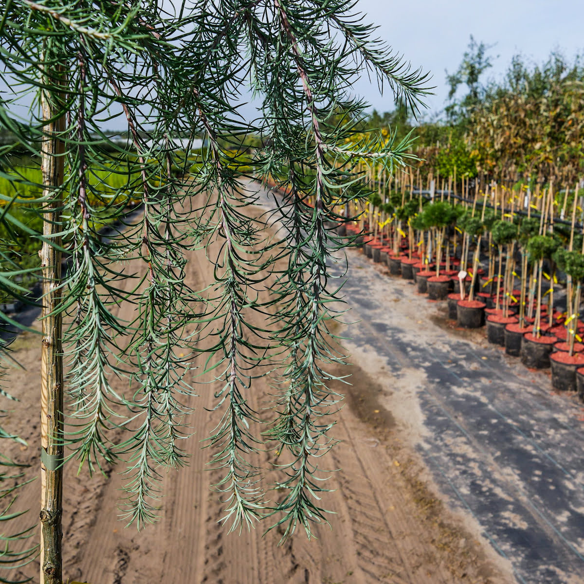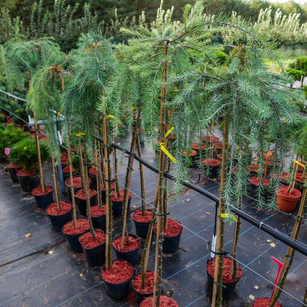 Modrzew europejski Pendula na pniu to odmiana tego drzewa, która charakteryzuje się pięknym, smukłym kształtem korony w formie łezki oraz srebrzystoszarą korą. Szczególną cechą tej odmiany jest również to, że jest ona szczepiona na pniu, co pozwala uzyskać efektowne drzewo dekoracyjne do ogrodów i parków.