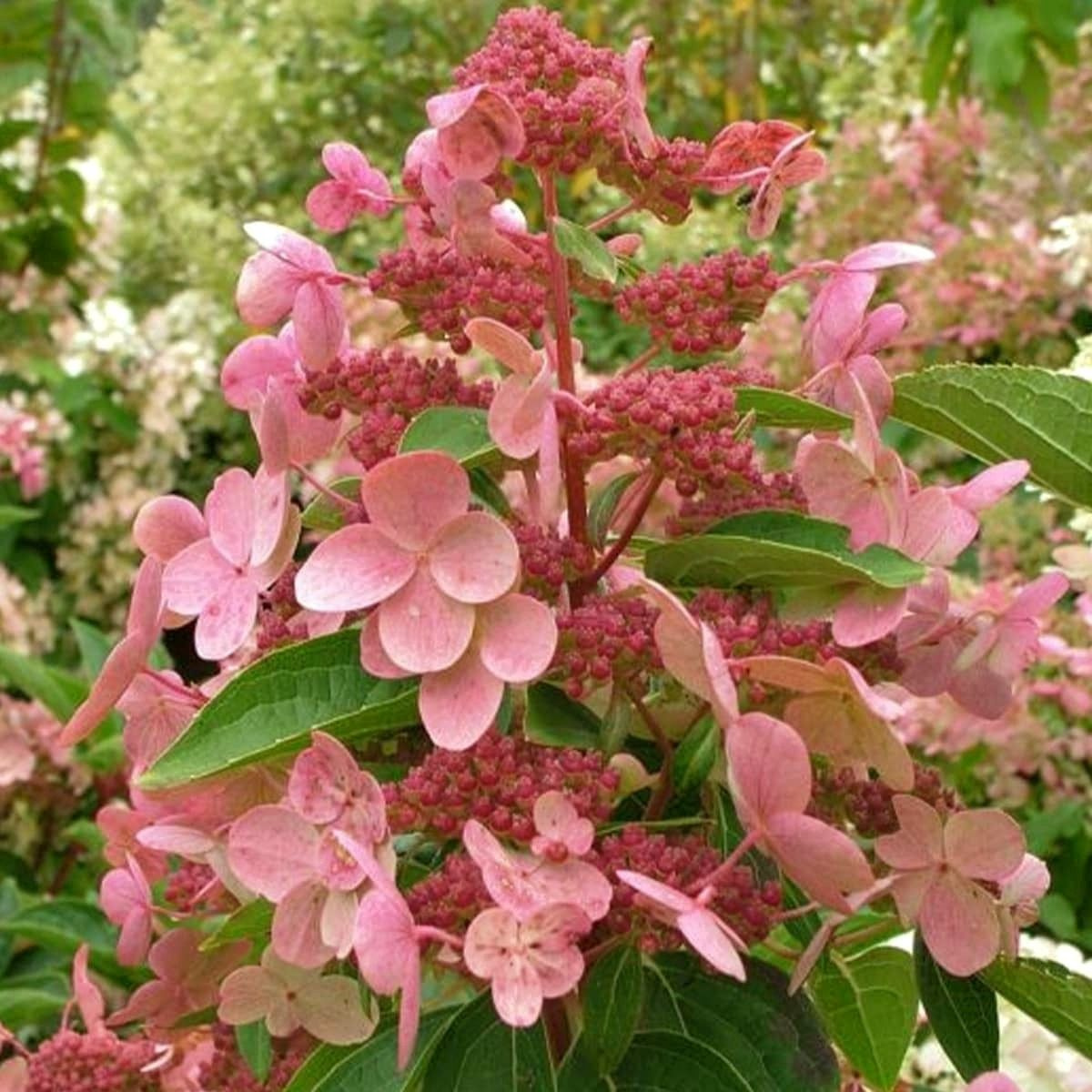 Kwitnienie hortensji Dharuma to jedna z jej najbardziej wyjątkowych cech. W przeciwieństwie do większości hortensji bukietowych, które zaczynają kwitnąć dopiero latem, Dharuma rozwija pierwsze kwiaty już w czerwcu, a w sprzyjających warunkach nawet pod koniec maja. Kwiatostany mają stożkowaty kształt i średnią wielkość, co idealnie pasuje do niewielkiego pokroju krzewu. Są złożone z drobnych, subtelnych kwiatów – początkowo białych lub kremowych, a w miarę przekwitania przebarwiają się na różowo, zyskując ciepłe, pastelowe tonacje. Proces zmiany barwy przebiega stopniowo, co sprawia, że krzew przez długi czas prezentuje się niezwykle atrakcyjnie – zróżnicowanie kolorów na jednym egzemplarzu jest naturalnym efektem sezonowym. Kwitnienie trwa do sierpnia–września, a kwiatostany długo utrzymują się na pędach, nawet po przekwitnięciu. To sprawia, że odmiana Dharuma zdobi ogród przez większą część sezonu i może być wykorzystywana także jako kwiat cięty lub w dekoracjach z kwiatów suszonych.