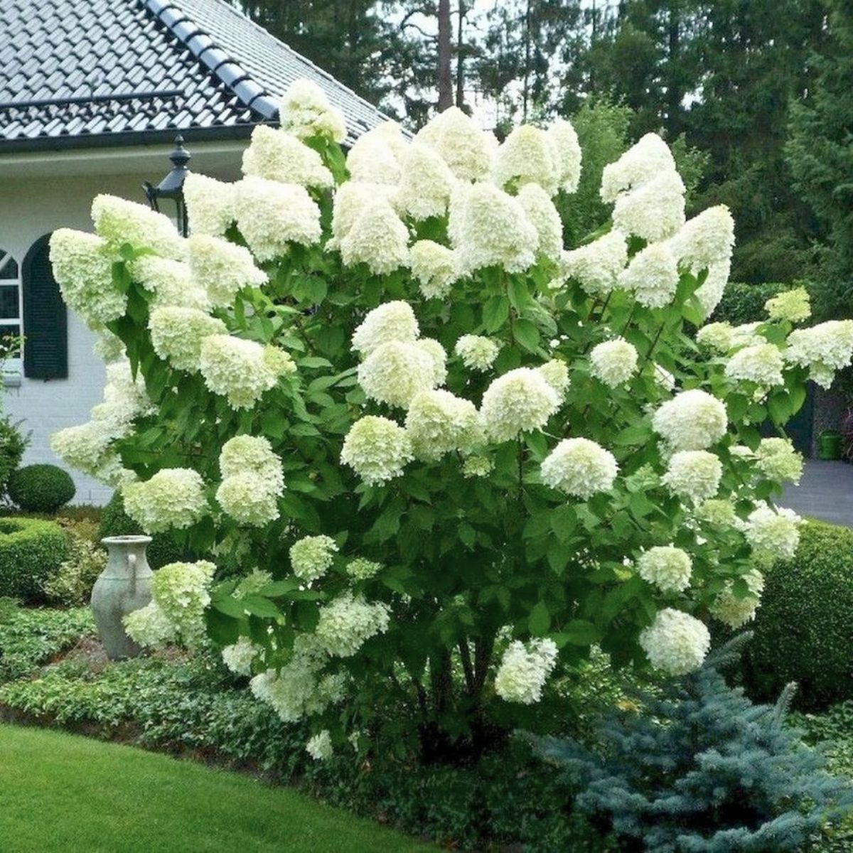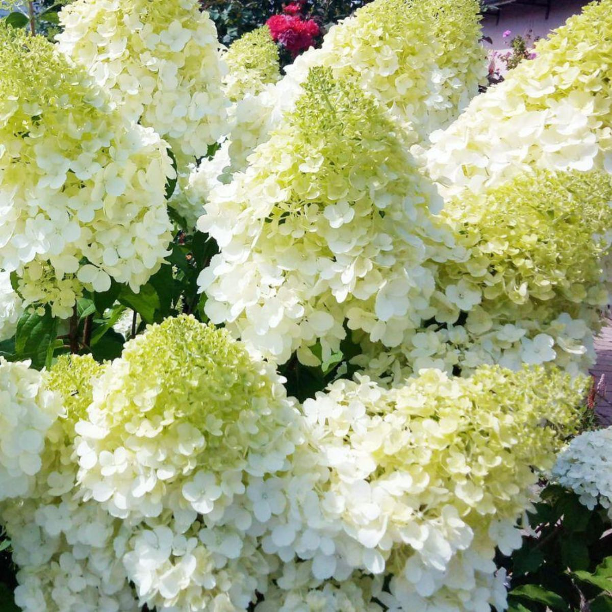 Kwitnienie hortensji bukietowej Polar Bear rozpoczyna się w lipcu i trwa aż do października, wprowadzając do ogrodu długi, efektowny sezon dekoracyjny. Kwiatostany są duże, stożkowate i gęsto wypełnione drobnymi kwiatami, które zmieniają barwę w miarę rozwoju – początkowo mają zielonkawo-kremowy odcień, następnie stają się czysto białe, a pod koniec sezonu mogą delikatnie różowieć. Dzięki temu naturalnemu przejściu kolorystycznemu roślina zachowuje świeży, elegancki wygląd przez wiele tygodni. Kwiaty utrzymują się długo na krzewie, są odporne na opady i dobrze znoszą zmienne warunki pogodowe. To doskonały wybór dla tych, którzy szukają sadzonki hortensji, która będzie cieszyć oko przez drugą połowę lata i jesień, a jednocześnie dobrze komponuje się z innymi sadonkami krzewów liściastych.