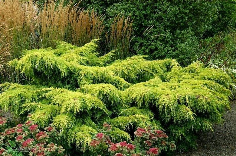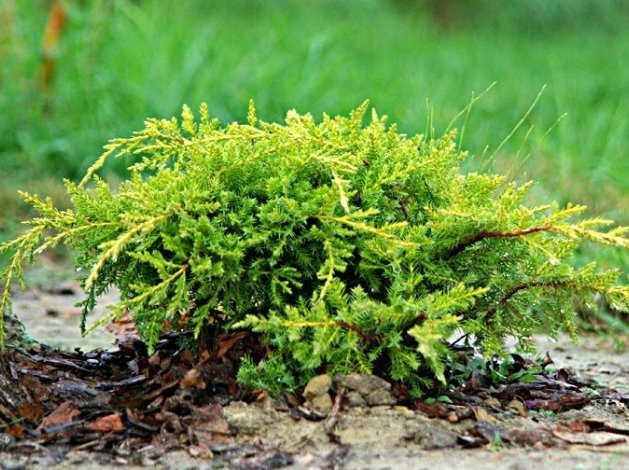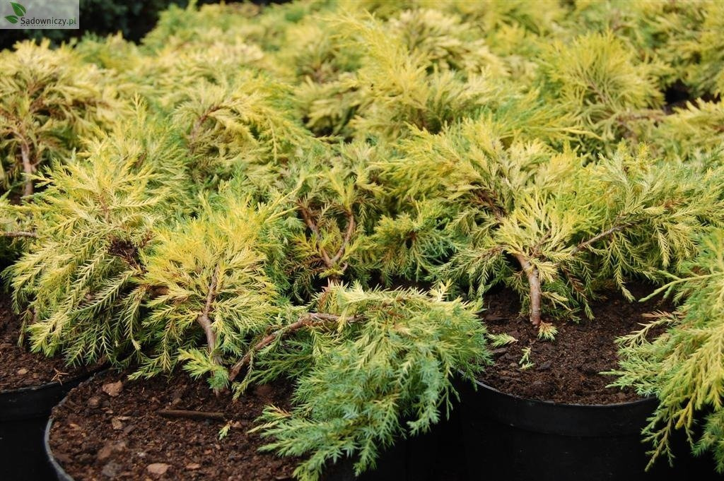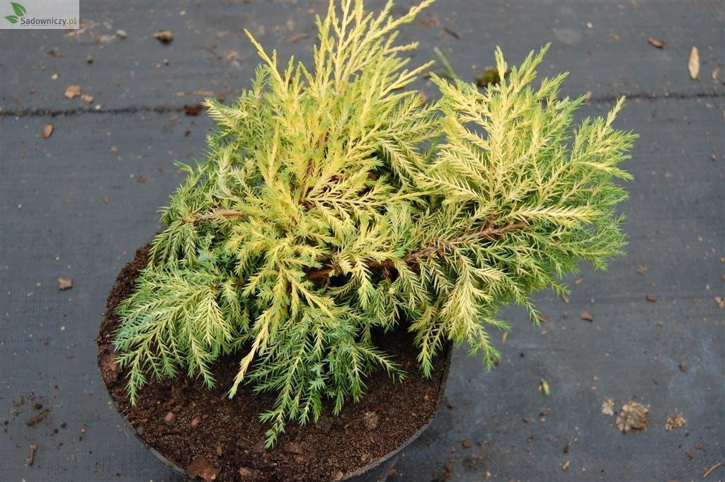 Krzew iglasty o rozłożystym pokroju i lekko przewisających pędach bocznych. Igły i łuski intensywnie złocistożółte. Po 10 latach osiąga ok 1 metra wysokości i około metr średnicy.Stanowisko słoneczne do półcienistego