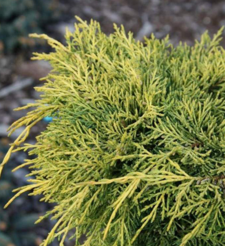 Ulistnienie na młodych przyrostach intensywnie ciemno złocistożółte, starsze, dwuletnie łuski w głębi krzewu jasnozielone.