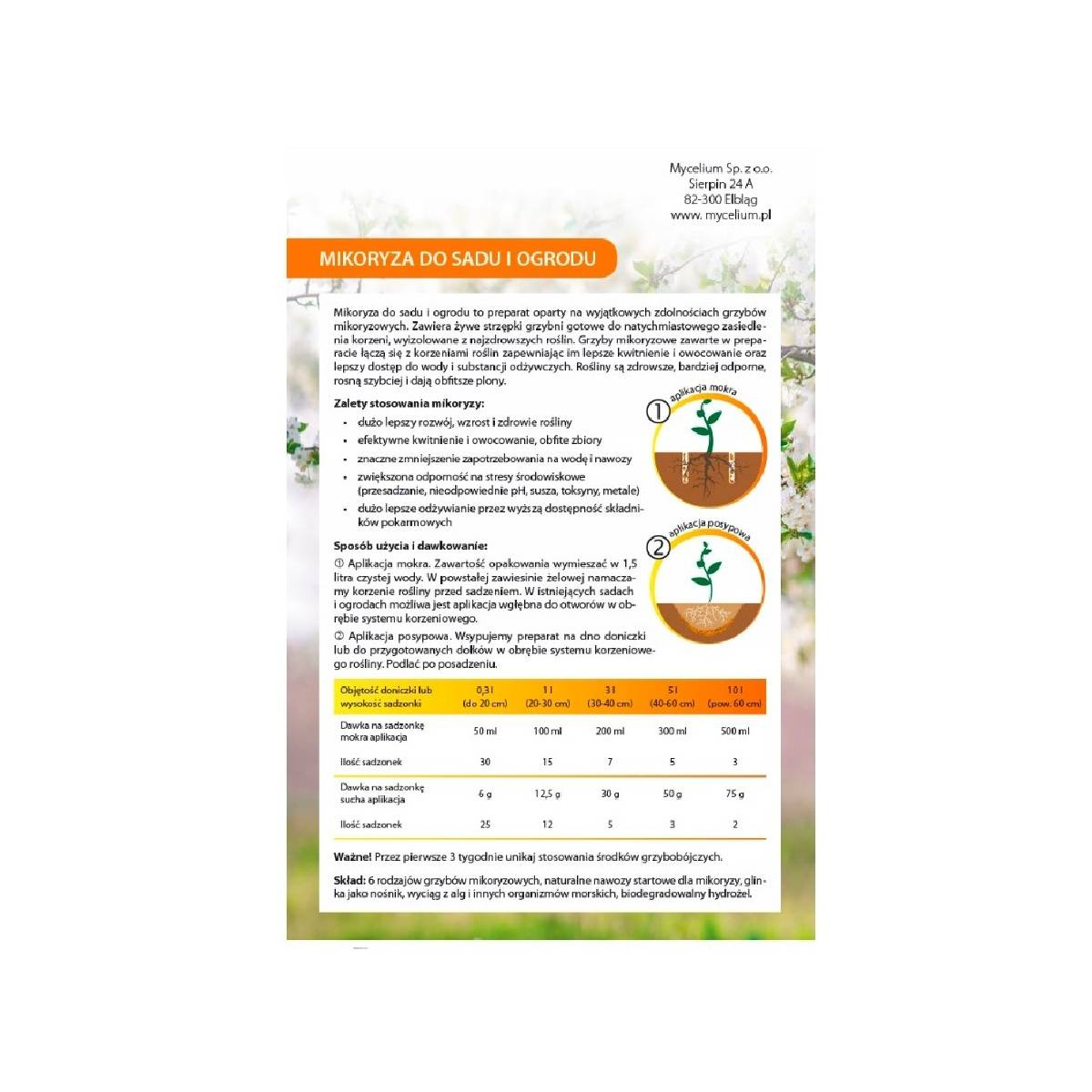 Zawartość opakowania wymieszać w 1,5 l czystej wody. W powstałym roztworze należy namaczać korzenie przed posadzeniem rośliny. Ta metoda daję najlepsze efekty, ponieważ dokładnie pokrywamy całą powierzchnię korzeni, dając mikoryzie natychmiastową możliwość do rozwoju.