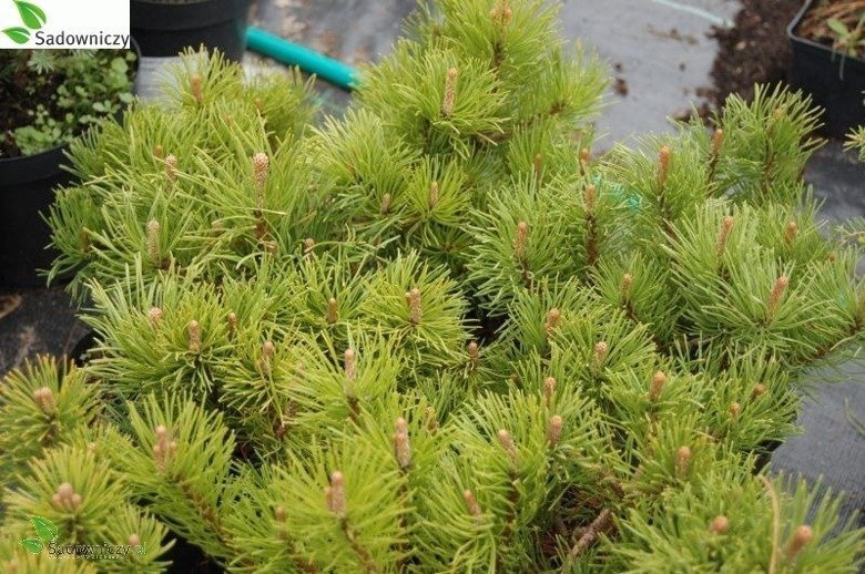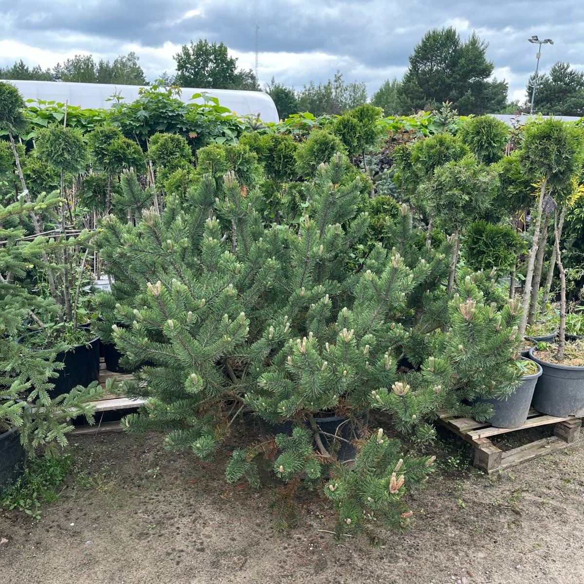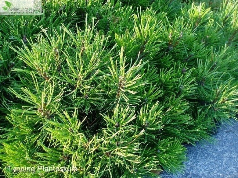 Pinus mugo var.pumilio| Niski, rozpostarty krzew o powolnym wzroście, osiągający po 30 latach około 2 m wys. przy ponad 2 m średnicy. Pędy nisko rozpostarte nad ziemią, ścielące się. Igły krótkie, ciemnozielone, kłujące.