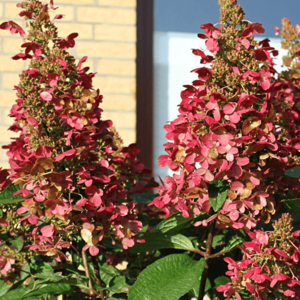 Hortensja bukietowa Wim's Red (Hydrangea paniculata 'Wim’s Red') to wyjątkowa odmiana hortensji bukietowej, która zachwyca nie tylko swoją formą, ale i zmieniającym się w czasie kwitnienia kolorem kwiatów. To szybko rosnący krzew liściasty, osiągający wysokość od 1,5 do 2 metrów, o wyprostowanym pokroju i mocnych pędach, które bez problemu utrzymują ciężkie, wiechowate kwiatostany. Odmiana Wim’s Red słynie z efektownych, stożkowatych kwiatów, które rozpoczynają sezon jako kremowobiałe, z czasem przebarwiają się na różowo, a u schyłku lata przybierają intensywnie czerwono-bordowy odcień. Kwitnie długo – od lipca do września, często nawet do października – co czyni ją jedną z najbardziej widowiskowych pozycji wśród dostępnych na rynku sadzonek hortensji.