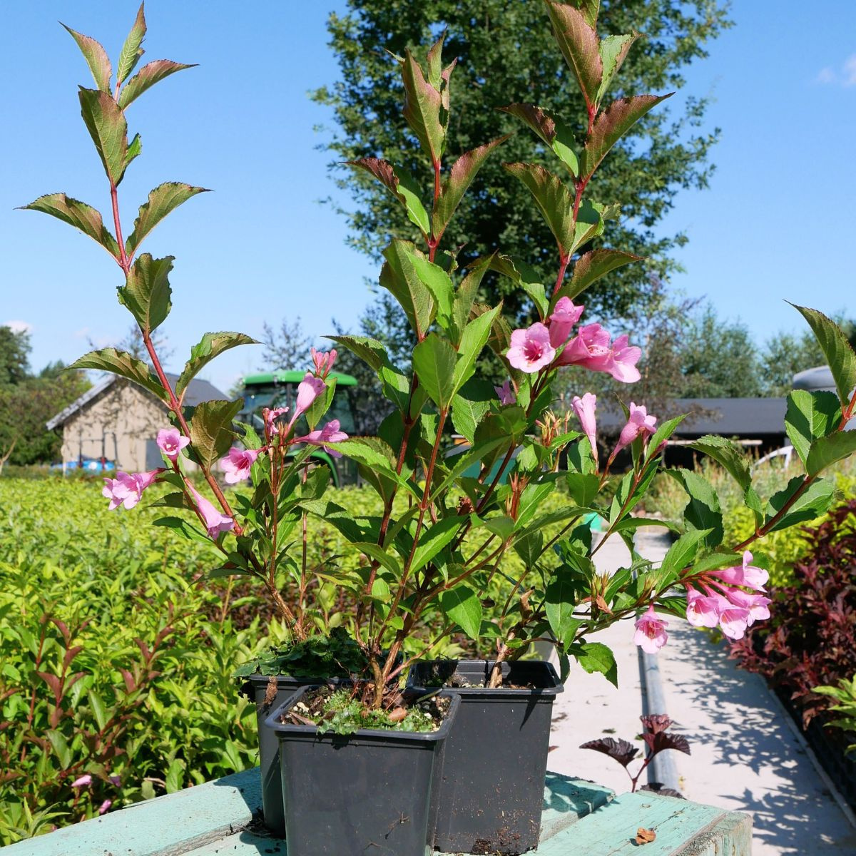 Krzewuszka cudowna Eva Rathke (Weigela florida 'Eva Rathke') to jedna z najbardziej efektownych odmian krzewuszki ozdobnej, ceniona za swoje wyjątkowe, dekoracyjne walory i obfite kwitnienie. To rozłożysty krzew liściasty, który zachwyca zarówno kształtem pokroju, jak i kolorem kwiatów. Sadzonki krzewuszki tej odmiany wyróżniają się elegancją i intensywnym wybarwieniem, które doskonale wpisuje się w kompozycje rabatowe i ogrodowe. Jej dynamiczny rozwój i tolerancja na warunki atmosferyczne czynią ją jedną z ulubionych roślin ogrodników i miłośników roślin ozdobnych. Eva Rathke to krzew o dość szybkim tempie wzrostu. Już w ciągu kilku sezonów może osiągnąć swoją docelową wysokość, która wynosi od 1,5 do 2 m. Pędy są dość sztywne, lekko przewieszające się, a ich ciemnoczerwony odcień wspaniale kontrastuje z zielenią liści. Dzięki takiej strukturze, krzew łatwo formuje się w zwartą i estetyczną bryłę, nie wymagając intensywnego cięcia. To idealny wybór do nasadzeń zarówno pojedynczych, jak i grupowych.