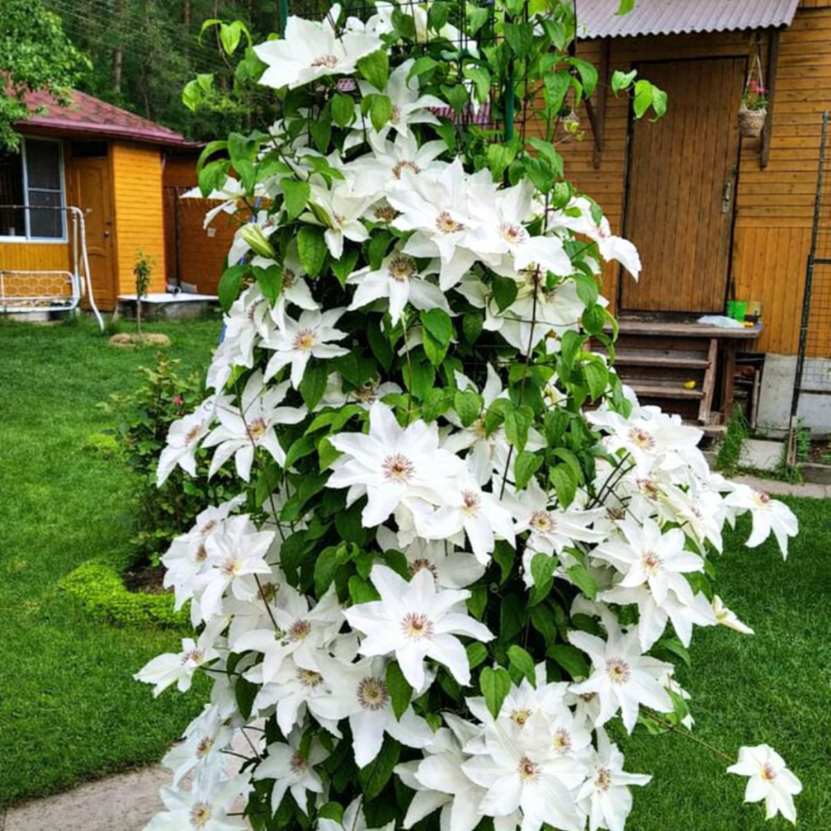 Powojnik Clematis Beautiful Bride tworzy silne pędy, które chętnie wspinają się po podporach i tworzą zwartą, zieloną strukturę obsypaną białymi kwiatami. Jego ozdobne kwiaty pojawiają się w sezonie, przynosząc efektowny akcent do ogrodu i przyciągając wzrok swoją czystością oraz liczbą kwiatów.