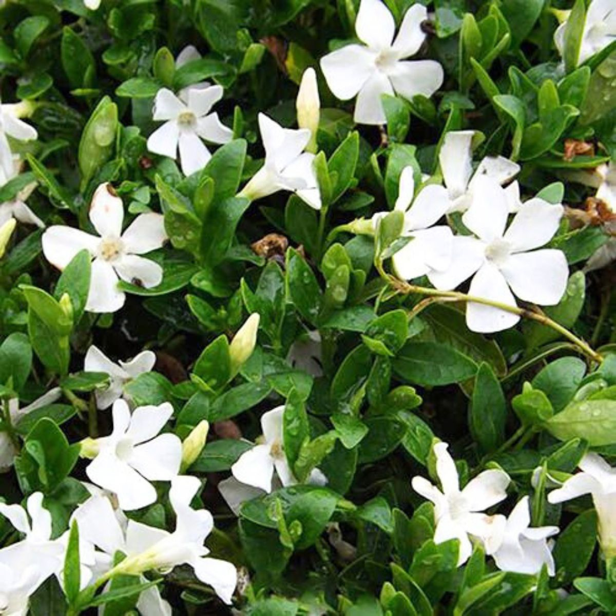 Barwinek większy 'Alba' (Vinca major) to zimozielona bylina okrywowa o białych kwiatach. Tworzy gęste dywany liści, które utrzymują się przez cały rok. Pędy rośliny mogą osiągać długość do 50 cm, a jej liście są większe i szersze niż u barwinka mniejszego. Jest doskonałym wyborem do sadzenia pod drzewami, na skarpach oraz w cienistych zakątkach ogrodu.
