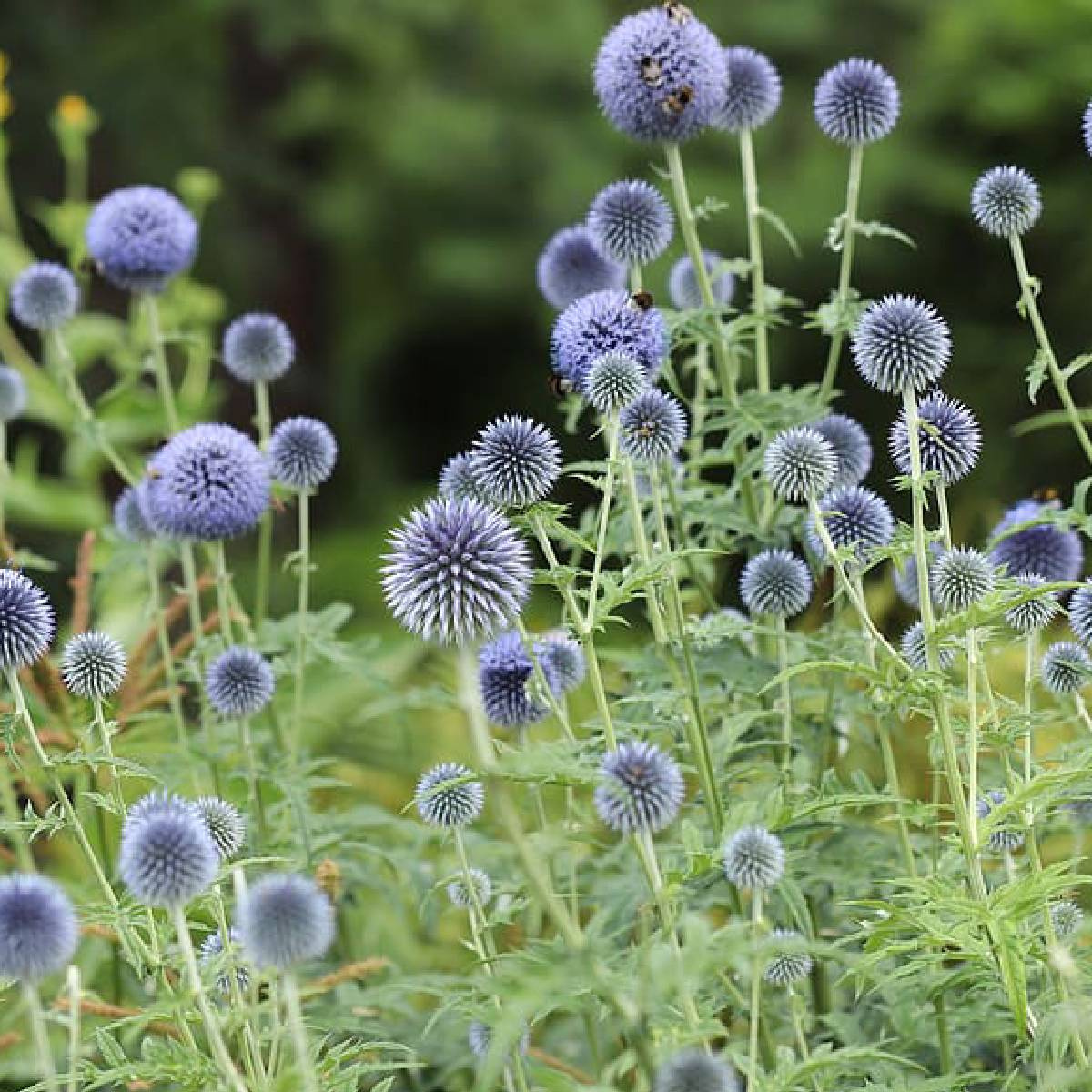 - Przegorzan – efektowny akcent z wysokimi, kulistymi kwiatostanami w kolorze niebieskim