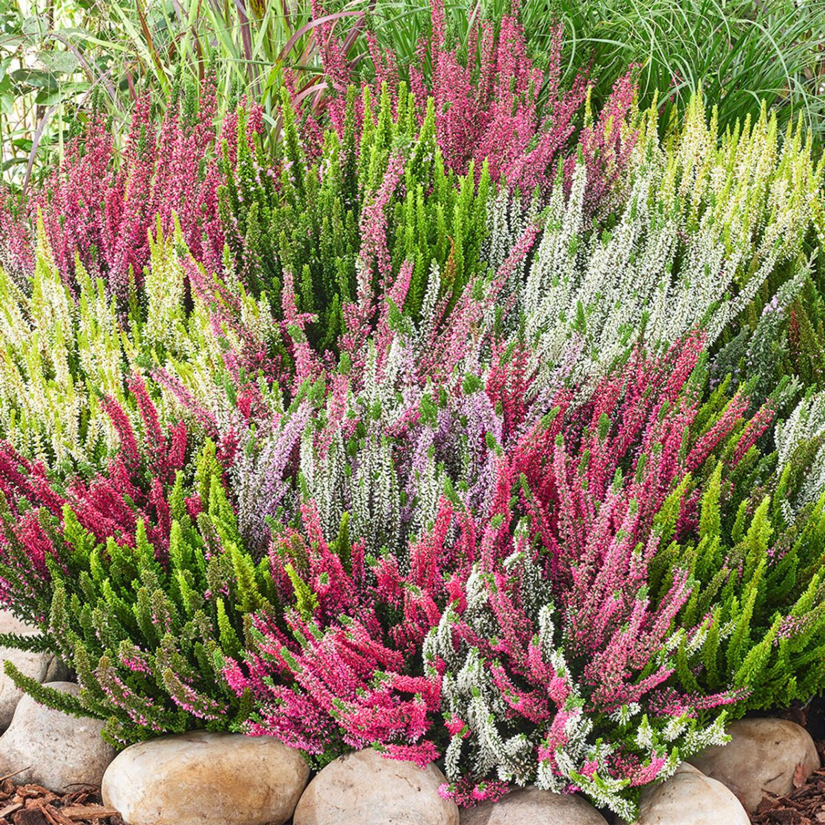 Zestaw łączy klasyczne wrzosy pączkowe o trwałych kolorach z nowoczesnymi, architektonicznymi odmianami Skyline. Rośliny długo utrzymują kolor, są zimozielone, zwarte i odporne na warunki atmosferyczne. Idealnie komponują się w niskich grupach, obwódkach, skrzynkach balkonowych i pojemnikach.