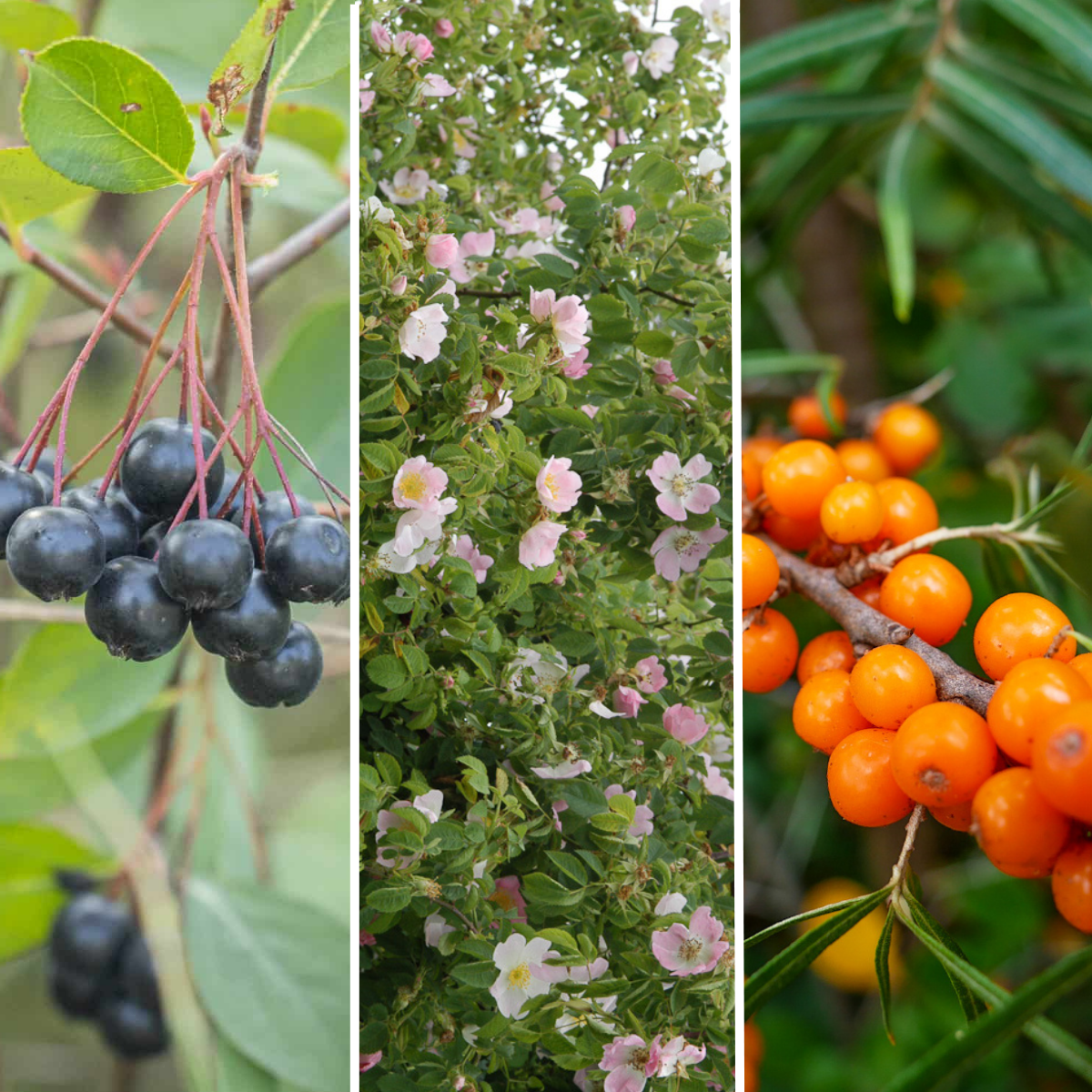 - Wysokość i szerokość: dzika róża 1–1,5 m, aronia 2–3 m, rokitnik 2–3 m.