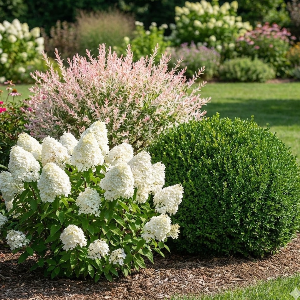 Hydrangea paniculata, Salix integra, Buxus se