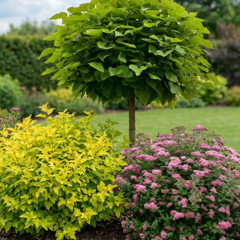 Pęcherznica kalinolistna zachwyca intensywnie żółtym ulistnieniem, które rozświetla rabatę przez cały sezon i pięknie kontrastuje z zielenią katalpy. W czerwcu pojawiają się drobne, jasne kwiatostany, a po nich dekoracyjne owocostany. Tawuła japońska wprowadza intensywny, różowy akcent kwiatowy latem, tworząc efekt barwnego dywanu u podstawy kompozycji.