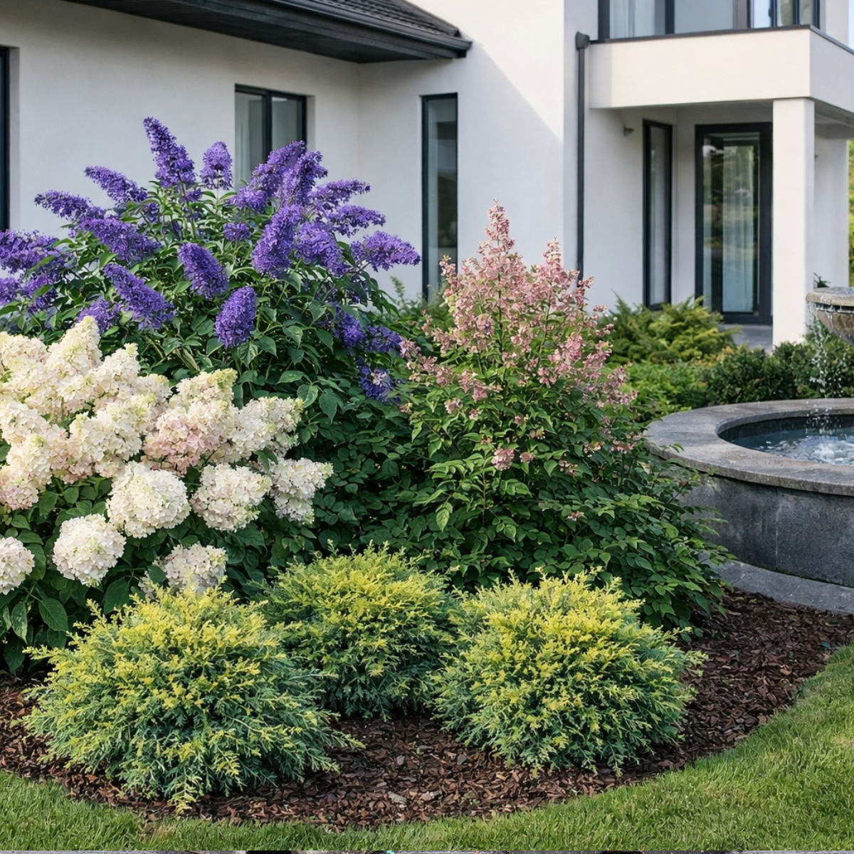 Kompozycję uzupełniają krzewy o zróżnicowanym charakterze: obficie kwitnąca hortensja, pachnąca budleja nazywana „motylim krzewem” oraz zimozielony jałowiec o dekoracyjnych igłach. Takie zestawienie zapewnia kontrast form, kolorów i faktur, a jednocześnie zachowuje naturalny, harmonijny wygląd nasadzeń.