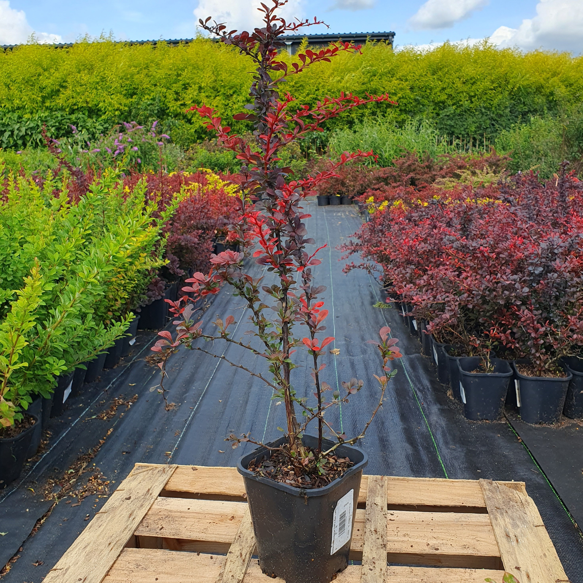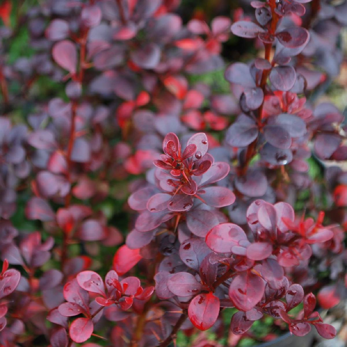Berberys Thunberga Dart’s Red Lady (Berberis thunbergii ‘Dart’s Red Lady’) to niska, rozłożysta odmiana berberysu o wyjątkowo dekoracyjnym, purpurowym ulistnieniu. Już od wczesnej wiosny krzew przyciąga wzrok intensywnie czerwono-fioletowym kolorem liści, który utrzymuje się aż do późnej jesieni. To roślina o gęstym, krzaczastym pokroju, który sprawia, że idealnie nadaje się do tworzenia barwnych obwódek, niskich żywopłotów oraz jako kontrastowy akcent na rabatach. Dart’s Red Lady rośnie stosunkowo wolno, co jest zaletą dla osób poszukujących roślin o przewidywalnym tempie rozwoju. Dorasta zazwyczaj do ok. 50–70 cm wysokości i podobnej szerokości, tworząc gęste, szerokie poduchy. Forma odmiany jest naturalnie zagęszczona, bez potrzeby częstego cięcia, co czyni sadzonki berberysu wyjątkowo łatwymi w pielęgnacji.