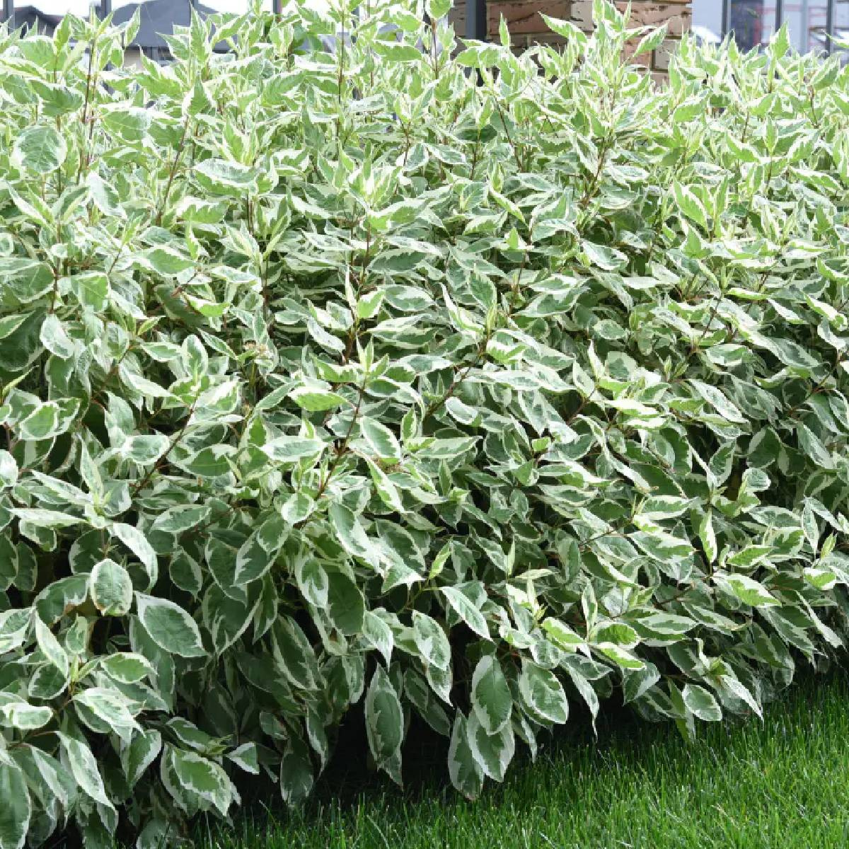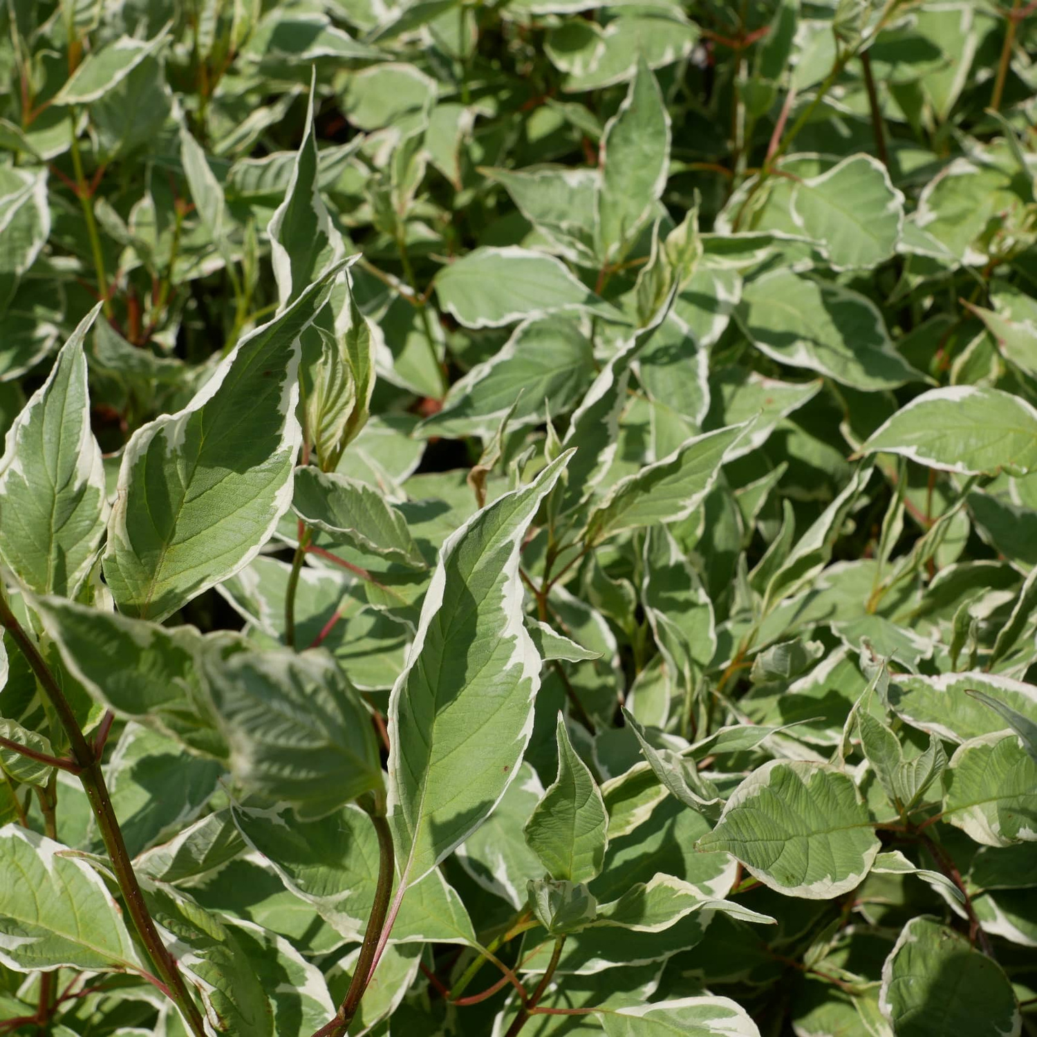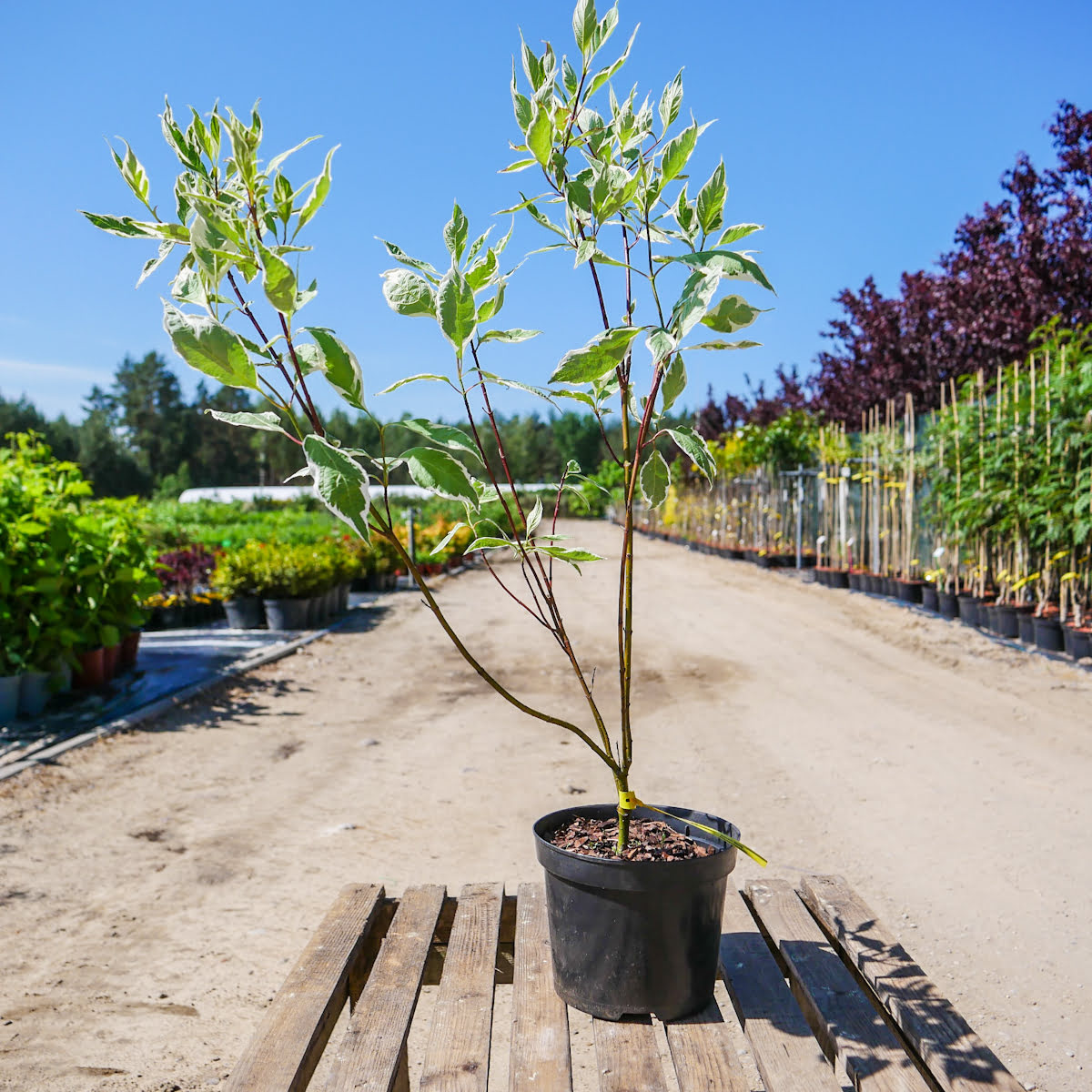 Dereń biały Elegantissima (Cornus alba ‘Elegantissima’) to odmiana, która od lat cieszy się ogromną popularnością. Jej największym atutem są liście o intensywnie zielonym środku i szerokim, kremowym marginesie, dzięki czemu roślina wprowadza do kompozycji efekt światła i kontrastu. Krzew rośnie szybko, tworząc wzniesiony, gęsty pokrój, osiągając docelowo 2–3 m wysokości oraz podobną szerokość. Już w pierwszych latach uprawy zyskuje pełny, rozłożysty kształt, dlatego sadzonki derenia tej odmiany od razu nadają rabatom i żywopłotom dekoracyjny charakter. Sadzonki krzewów liściastych Elegantissima są uznawane za klasykę, sprawdzoną i niezawodną w różnych warunkach siedliskowych.