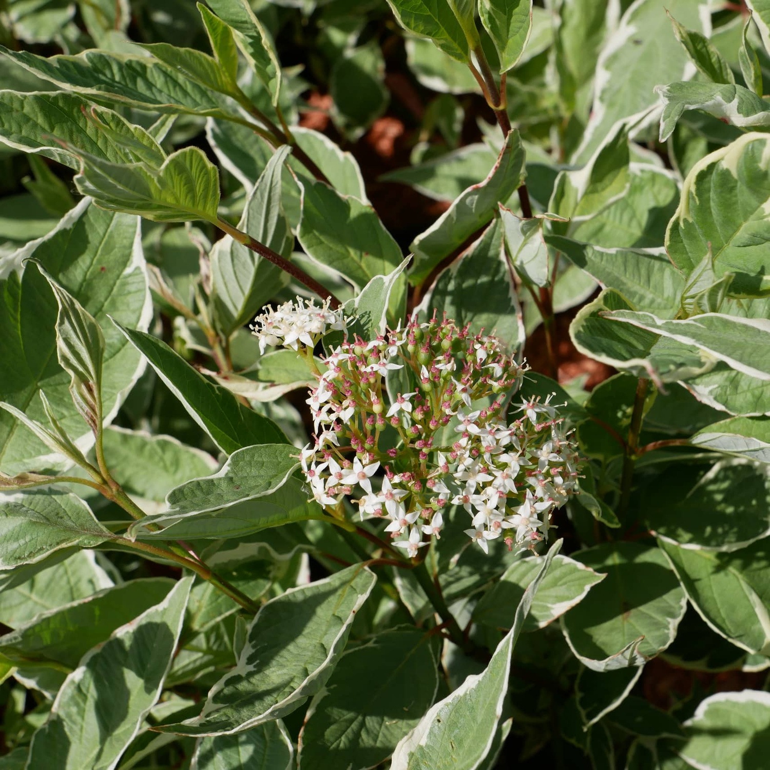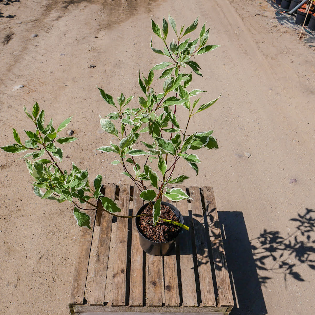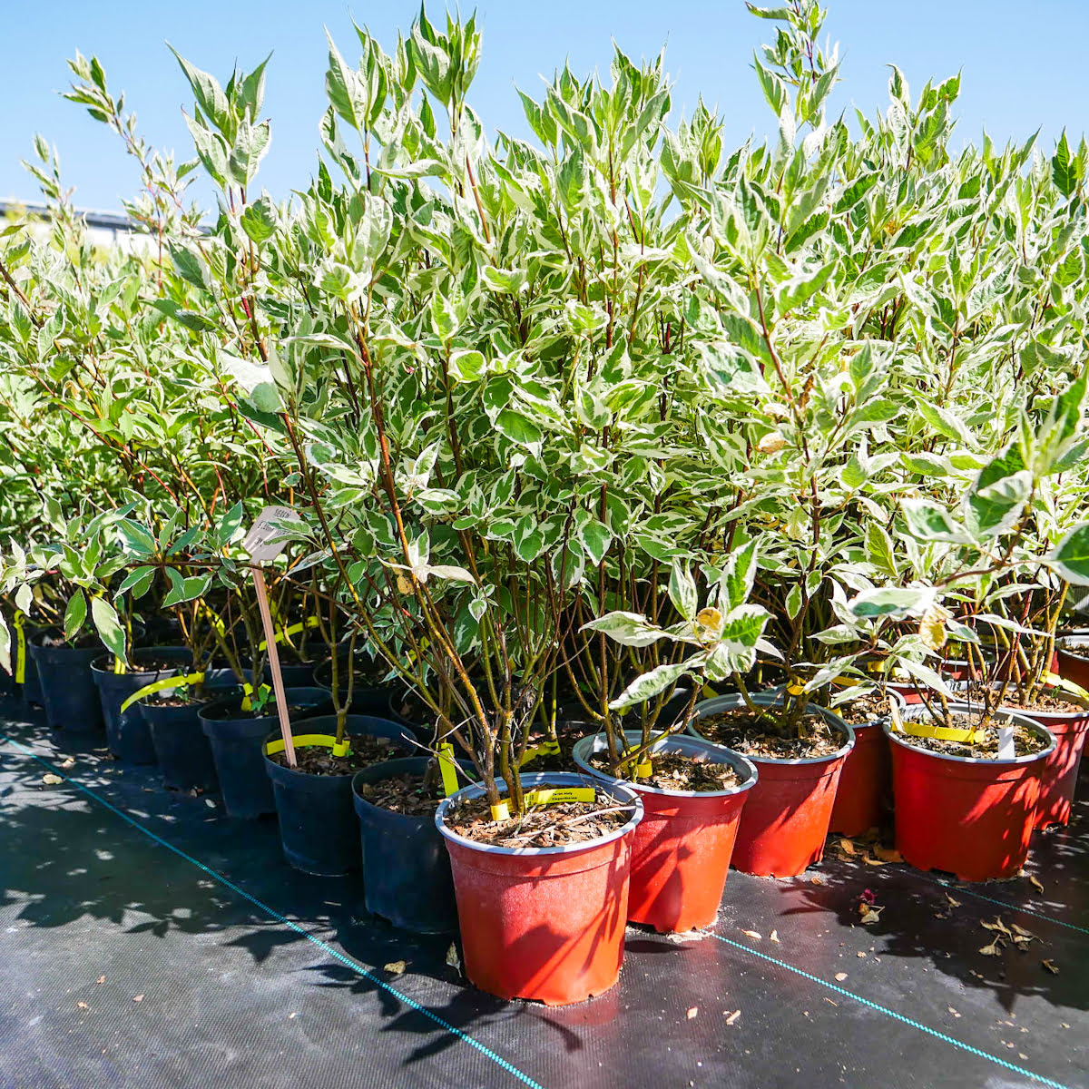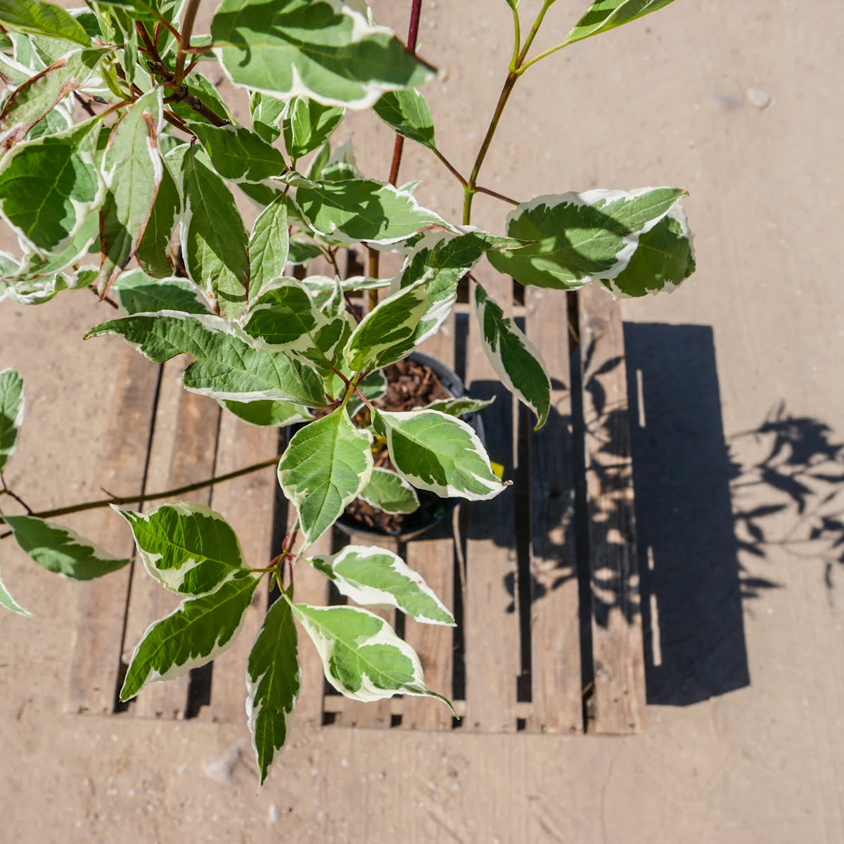 Dereń biały Elegantissima (Cornus alba ‘Elegantissima’) to odmiana, która od lat cieszy się ogromną popularnością. Jej największym atutem są liście o intensywnie zielonym środku i szerokim, kremowym marginesie, dzięki czemu roślina wprowadza do kompozycji efekt światła i kontrastu. Krzew rośnie szybko, tworząc wzniesiony, gęsty pokrój, osiągając docelowo 2–3 m wysokości oraz podobną szerokość. Już w pierwszych latach uprawy zyskuje pełny, rozłożysty kształt, dlatego sadzonki derenia tej odmiany od razu nadają rabatom i żywopłotom dekoracyjny charakter. Sadzonki krzewów liściastych Elegantissima są uznawane za klasykę, sprawdzoną i niezawodną w różnych warunkach siedliskowych.