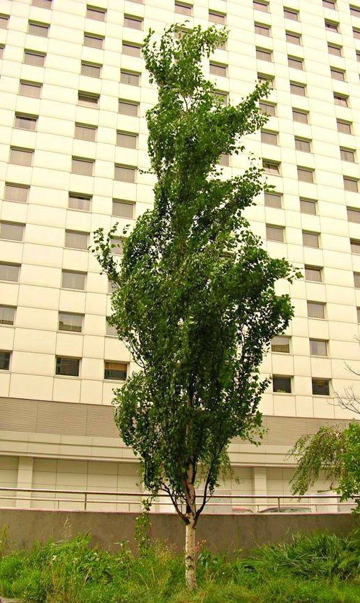Drzewo o pokroju kolumnowym. Gałęzie są sztywne, skierowane ku górze. Liście wcześnie rozwijają się wiosną, jesienią przebarwiają się na żółto. Odmiana bardzo dekoracyjna zimą, kiedy widać strukturę korony.