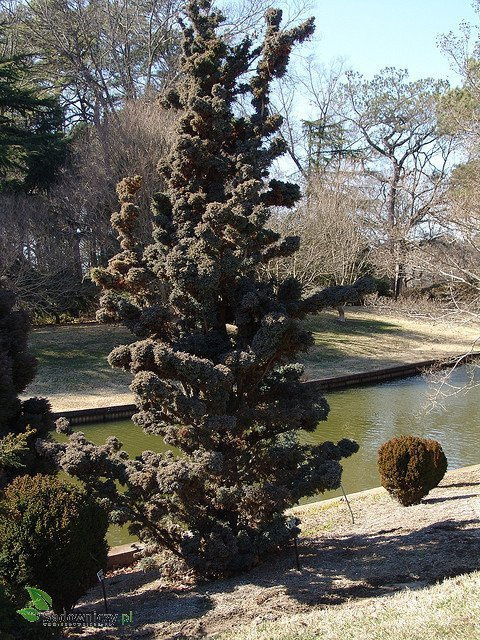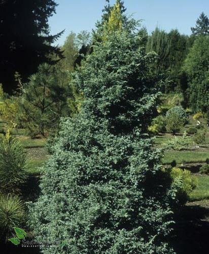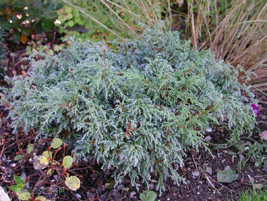 Charakteryzuje się dość nieuporządkowanym pokrojem, z charakterystycznymi, słabo rozgałęzionymi, długimi pędami mocno przewisającymi w dół. Wzrost wolny, zabarwienie szare, zielononiebieskie.Wys. do 2 m