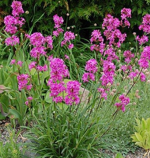 Z kępy liści wyrastają wzniesione łodygi 40–50 cm wysokości, rozgałęzione w górnej części i zakończone dość dużymi wiechowatymi kwiatostanami z kwiatami o intensywnym, różowo-karminowym kolorze.