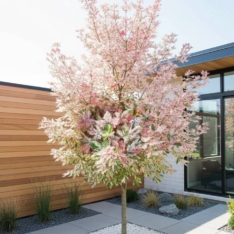 Klon jawor Purpureum Eskimo Sunset to niezwykle dekoracyjna odmiana wyróżniająca się nietypowym, wielokolorowym ulistnieniem. Sadzonka szczepiona na pniu tworzy efektowne, kompaktowe drzewko o eleganckiej, szerokostożkowej koronie, idealne zarówno do małych ogrodów, jak i przestrzeni miejskich. To jedna z najbarwniejszych odmian klonu jaworu – jej liście zmieniają kolor kilkukrotnie w ciągu sezonu, gwarantując spektakularny efekt wizualny.