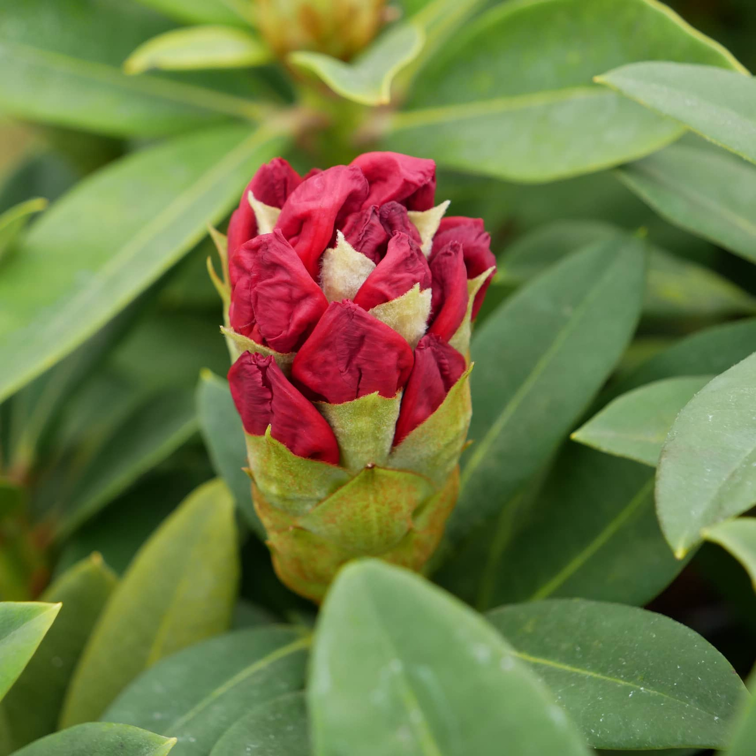 Kwitnienie rododendronu czerwonego to moment kulminacyjny sezonu – najczęściej przypada na maj i czerwiec. W tym czasie roślina pokrywa się licznymi, dużymi kwiatostanami złożonymi z kielichowatych kwiatów. Barwa kwiatów to głęboka czerwień, nasycona i intensywna, widoczna z daleka. W sprzyjających warunkach kwiaty utrzymują się przez 3–4 tygodnie.
